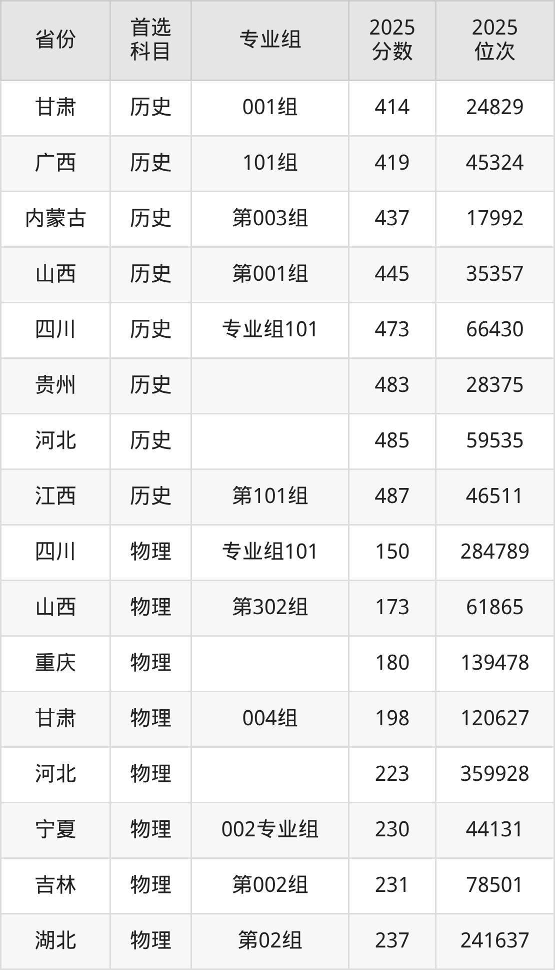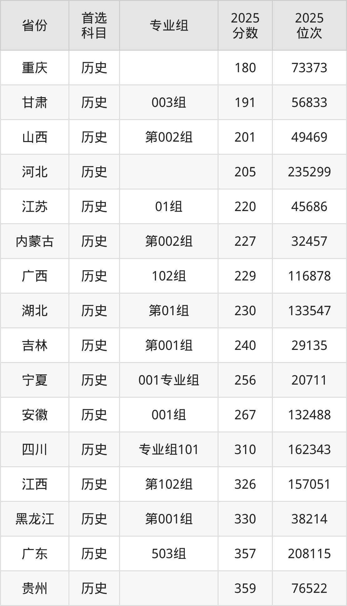 历史类最低分对应地区为重庆,录取位次为73373;最高分对应地区为江西(第101组),录取位次为46511,超本科线1分。