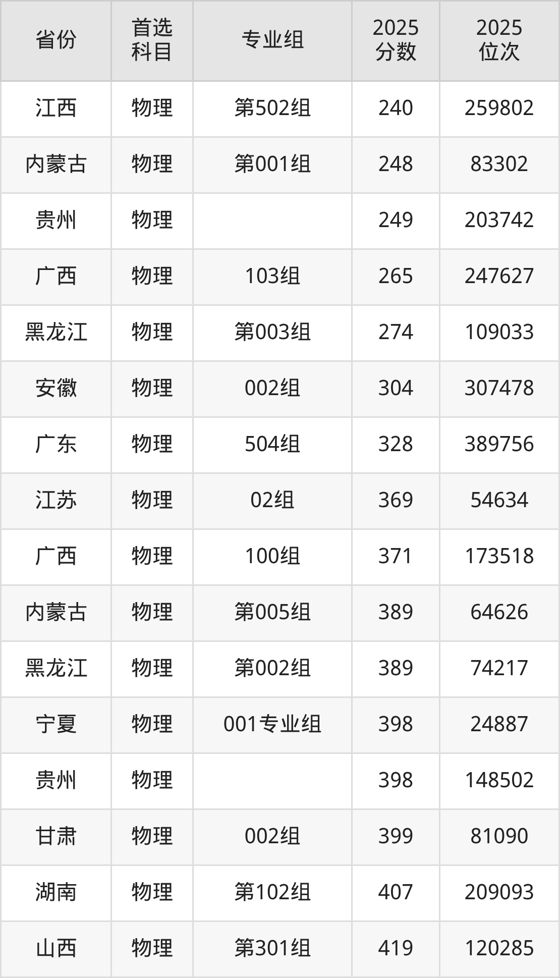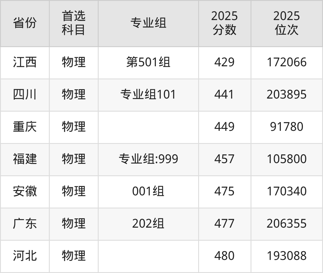 物理类最低分对应地区为四川(专业组101),录取位次为284789;最高分对应地区为河北,录取位次为193088,超本科线21分。