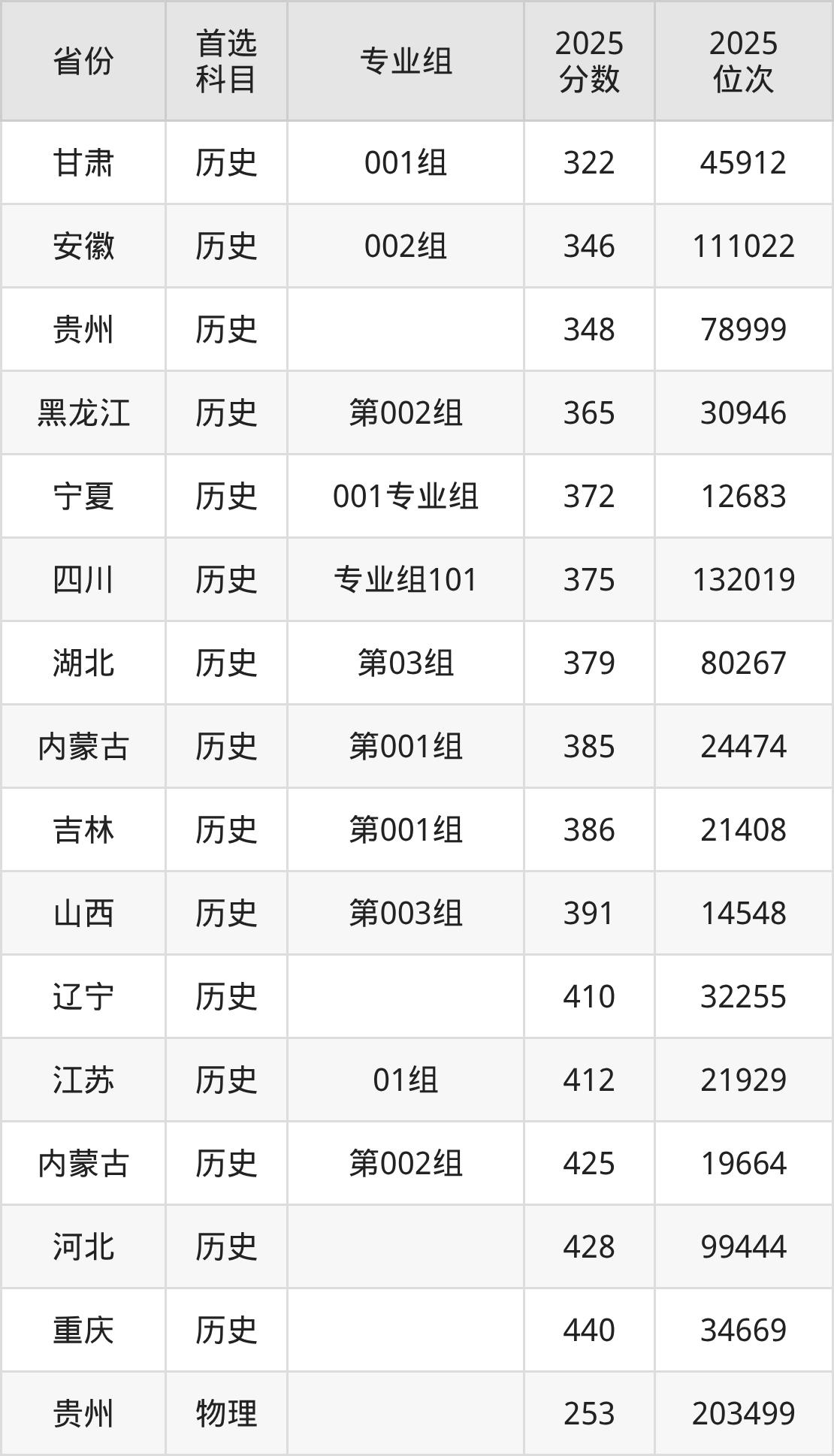 历史类最低分对应地区为甘肃(001组),录取位次为45912,超专科线162分;最高分对应地区为重庆,录取位次为34669。