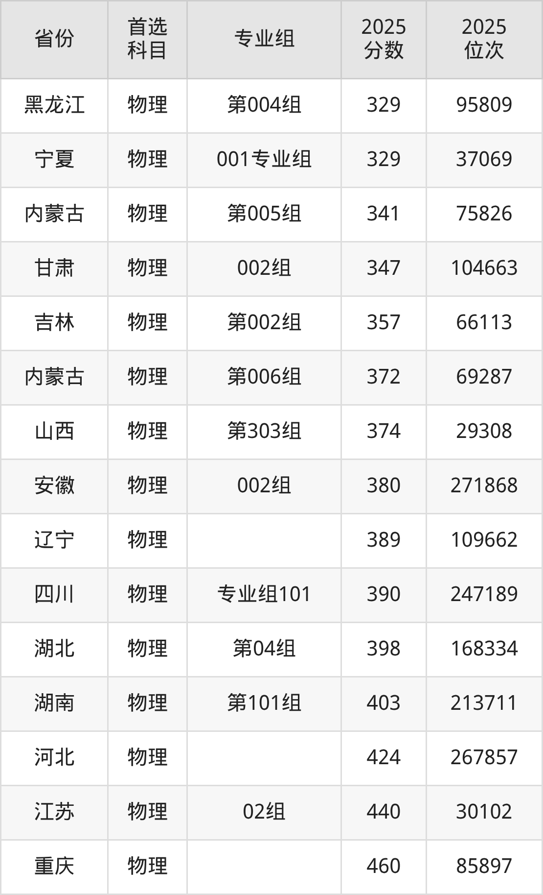 物理类最低分对应地区为贵州,录取位次为203499,超专科线73分;最高分对应地区为重庆,录取位次为85897。