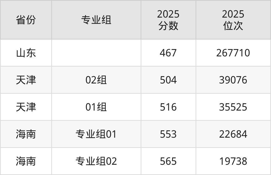 最低分对应地区为山东,录取位次为267710,超一段线61分;最高分对应地区为海南(专业组02),录取位次为19738,超本科线85分。