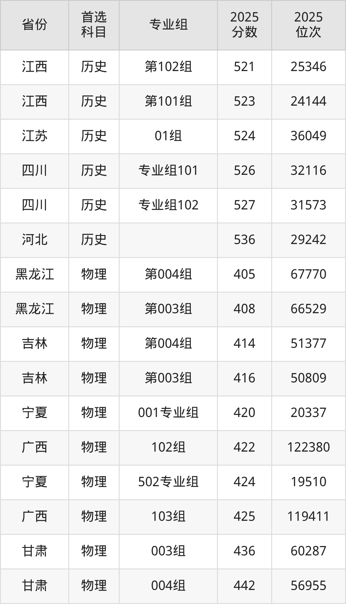 历史类:第001组485分、24597名,第002组514分、16518名,第003组(地方专项)483分、25125名,第004组(地方专项)507分、18367名;