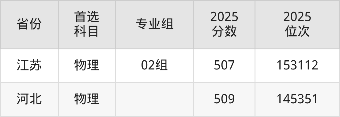 物理类最低分对应地区为黑龙江(第004组),录取位次为67770,超本科线45分;最高分对应地区为河北,录取位次为145351,超本科线66分。