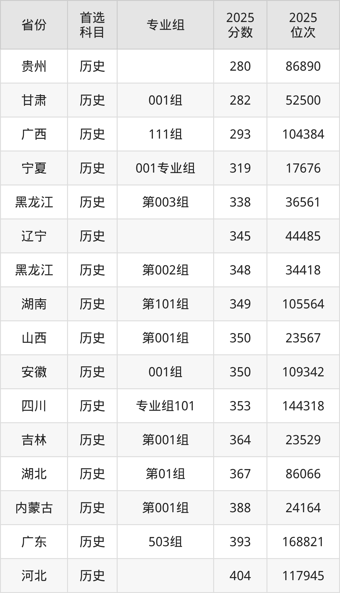 历史类最低分对应地区为贵州,录取位次为86890;最高分对应地区为江西(第101组),录取位次为86626,超专科线135分。