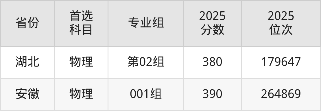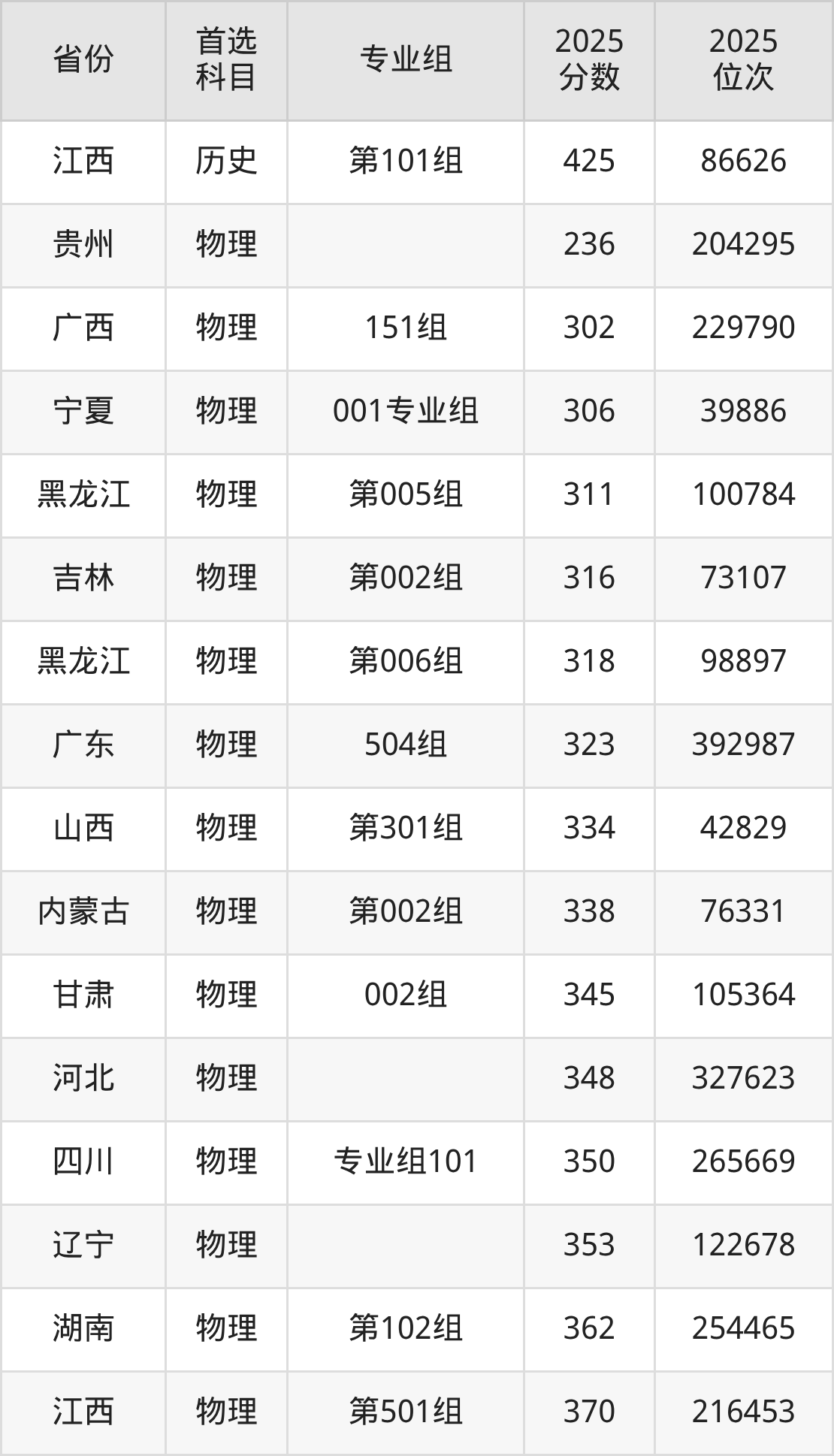 物理类最低分对应地区为贵州,录取位次为204295,超专科线56分;最高分对应地区为安徽(001组),录取位次为264869。