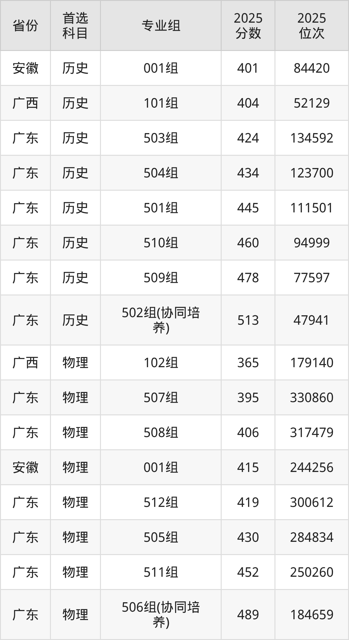 物理类最低分对应地区为广西(102组),录取位次为179140,超专科线165分;最高分对应地区为广东(506组(协同培养)),录取位次为184659,超专科线289分。