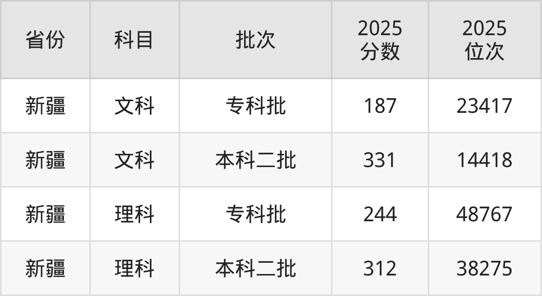 文科最低分对应地区为新疆,录取位次为23417,超专科线47分;最高分对应地区为新疆,录取位次为14418,超二本线1分。