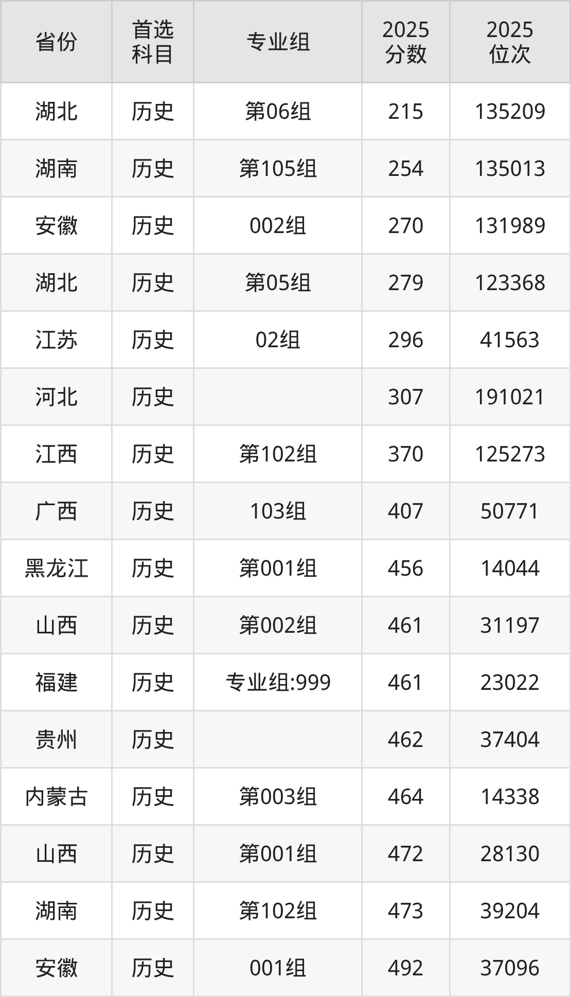 历史类最低分对应地区为湖北(第06组),录取位次为135209,超专科线15分;最高分对应地区为广东(204组),录取位次为45547,超本科线52分。