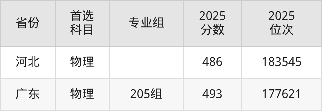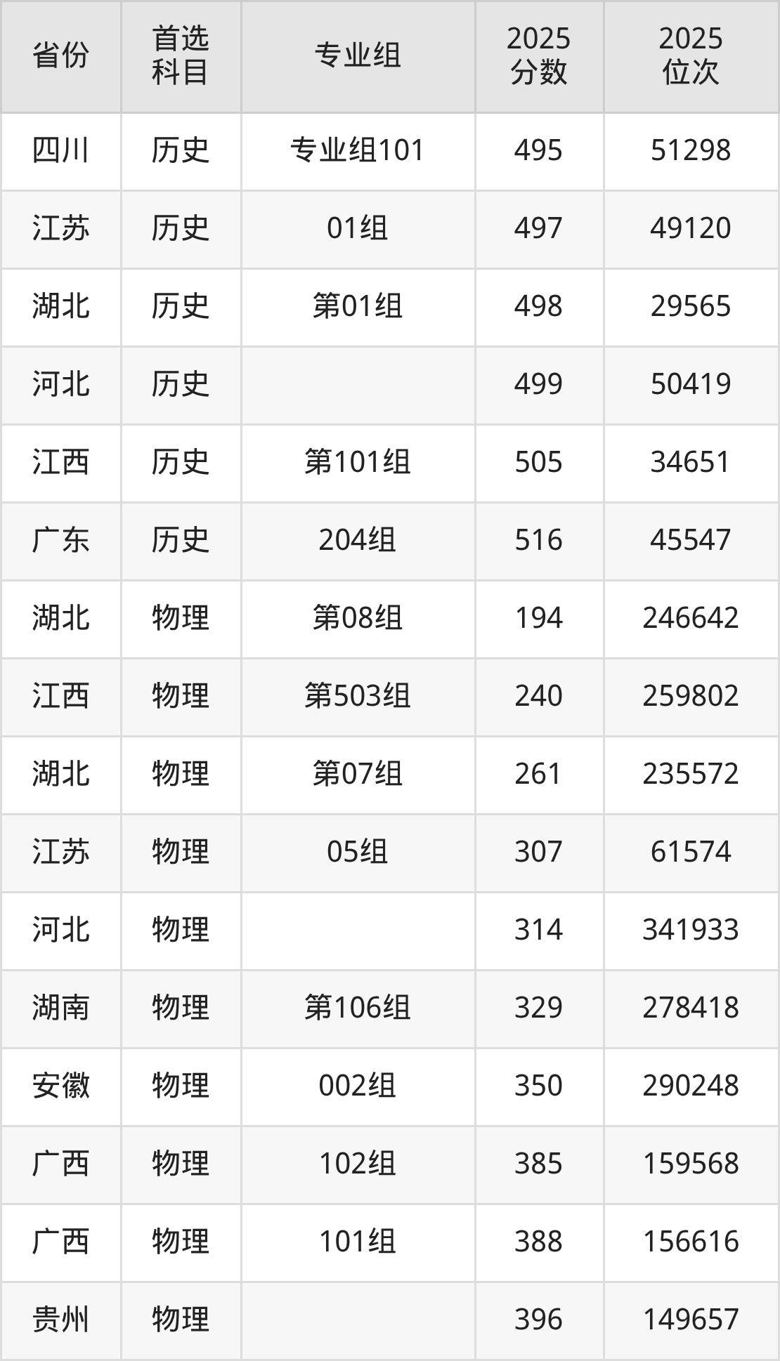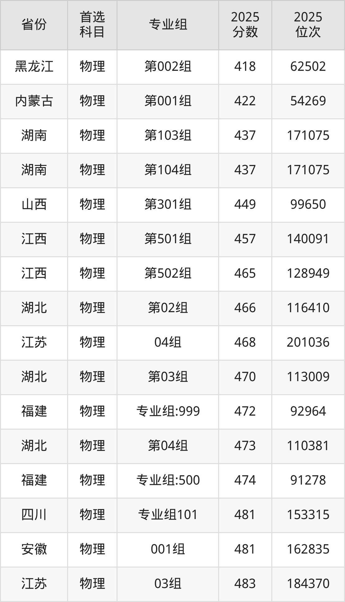 物理类最低分对应地区为湖北(第08组),录取位次为246642,低专科线6分;最高分对应地区为广东(205组),录取位次为177621,超本科线57分。