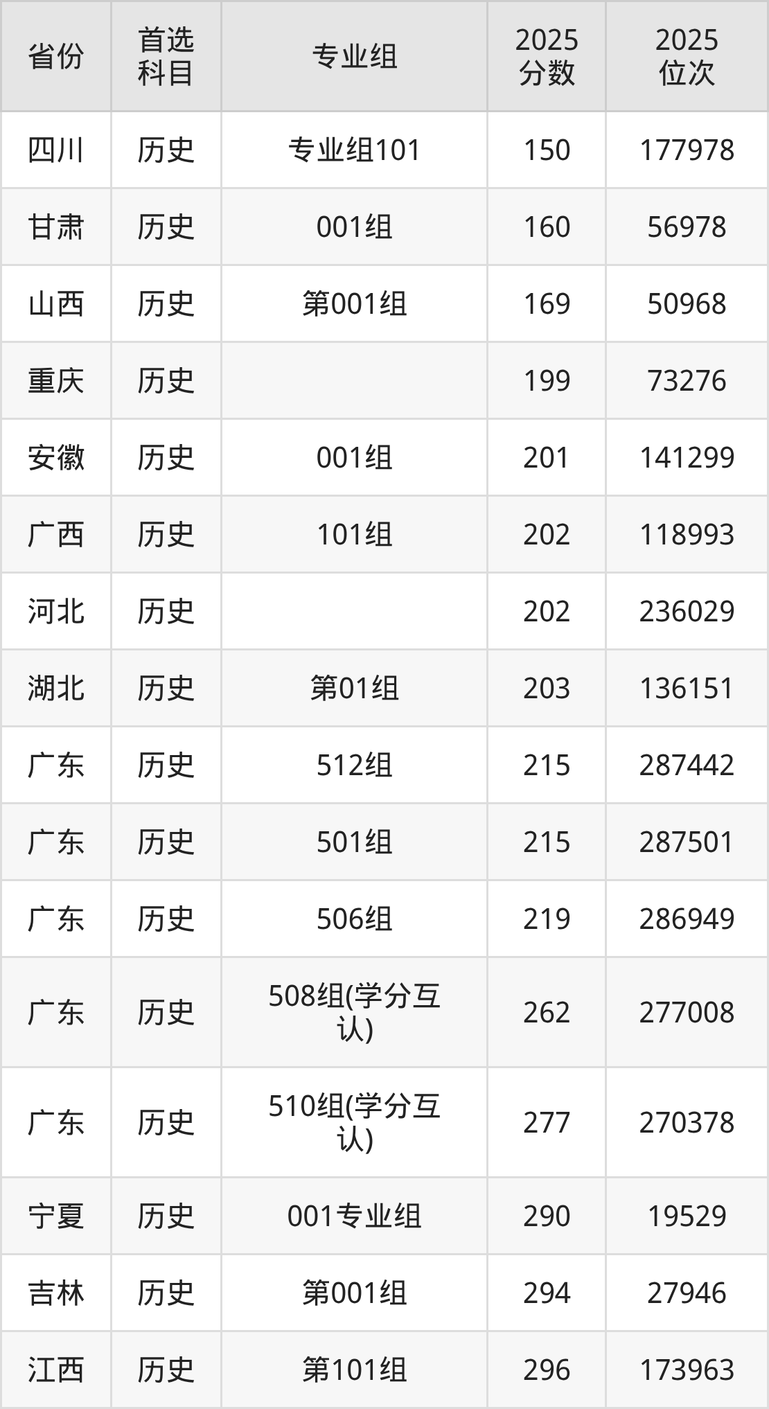 历史类:501组215分、287501名,506组219分、286949名,508组(学分互认)262分、277008名,510组(学分互认)277分、270378名,512组215分、287442名;