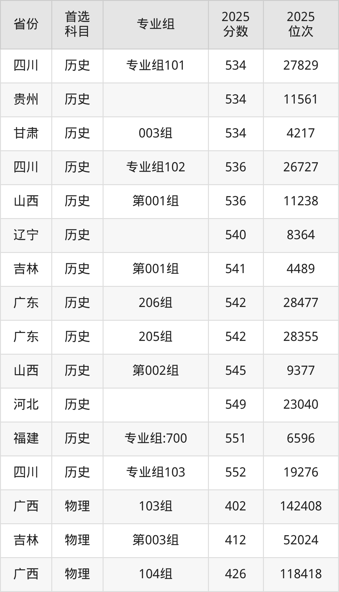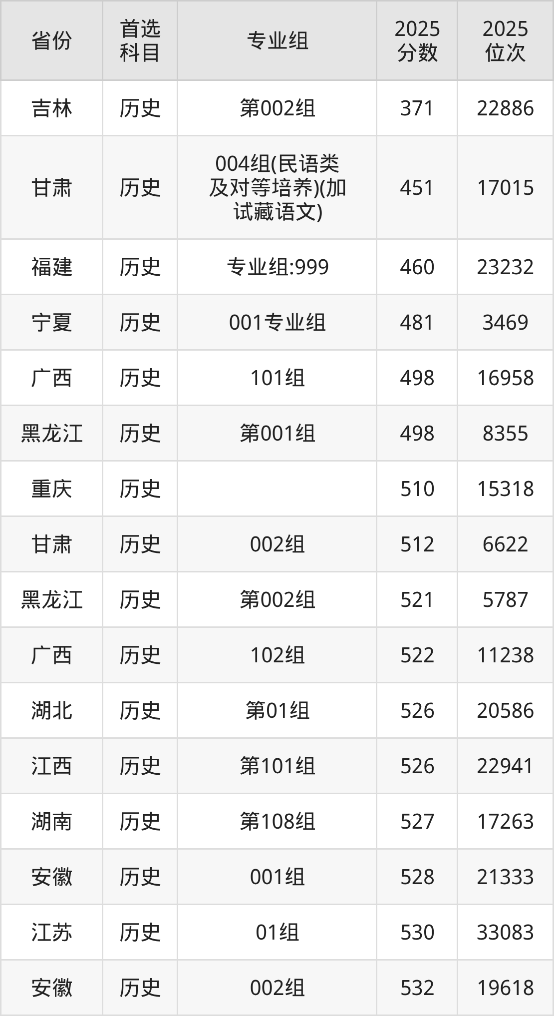历史类:001组528分、21333名,002组532分、19618名;