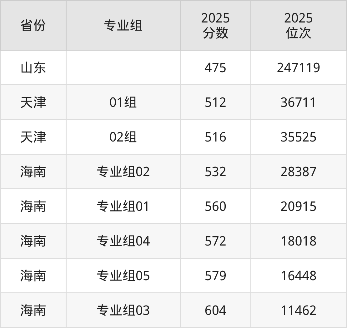最低分对应地区为山东,录取位次为247119,超一段线69分;最高分对应地区为海南(专业组03),录取位次为11462,超本科线124分。