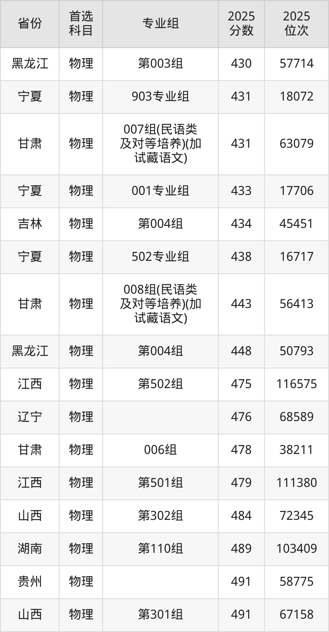 物理类:001组491分、139042名,002组518分、101642名;