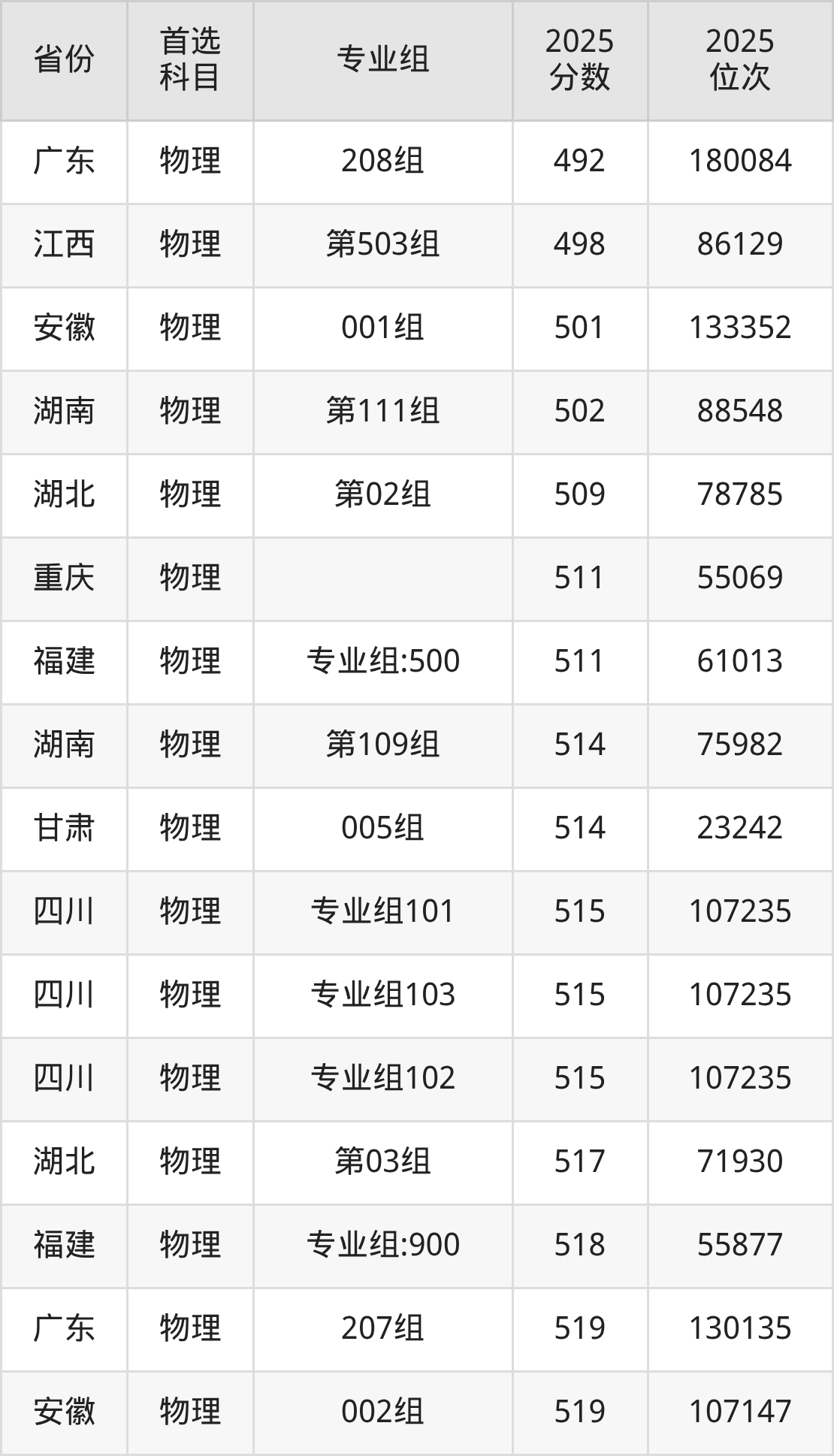 物理类:001组501分、133352名,002组519分、107147名;