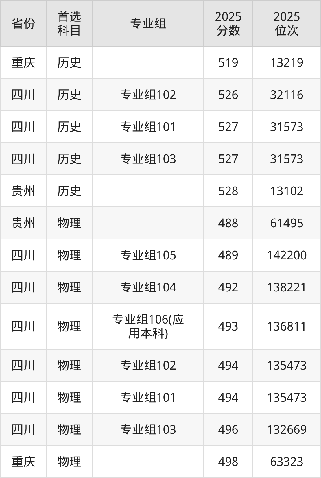物理类:专业组101494分、135473名,专业组102494分、135473名,专业组103496分、132669名,专业组104492分、138221名,专业组105489分、142200名,专业组106(应用本科)493分、136811名;