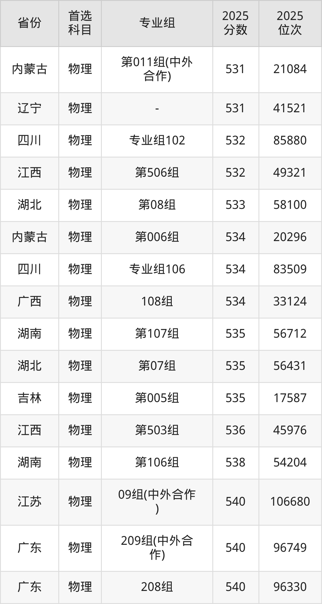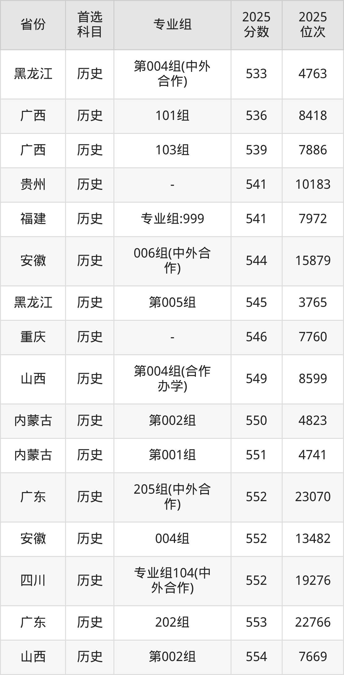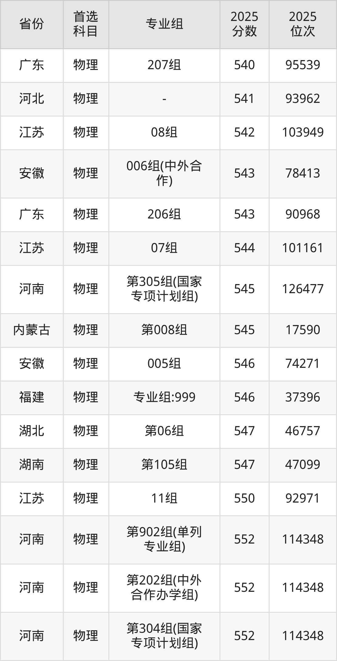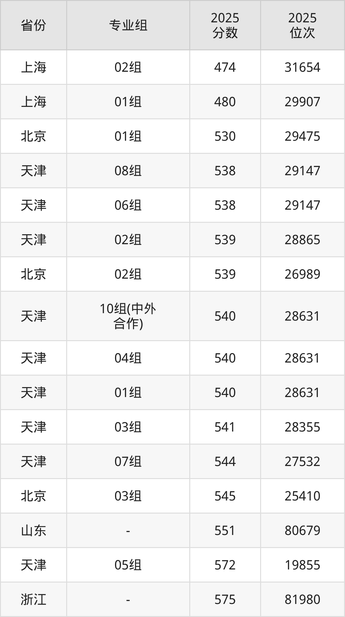 01组540分、28631名,02组539分、28865名,03组541分、28355名,04组540分、28631名,05组572分、19855名,06组538分、29147名,07组544分、27532名,08组538分、29147名,10组(中外合作)540分、28631名;
