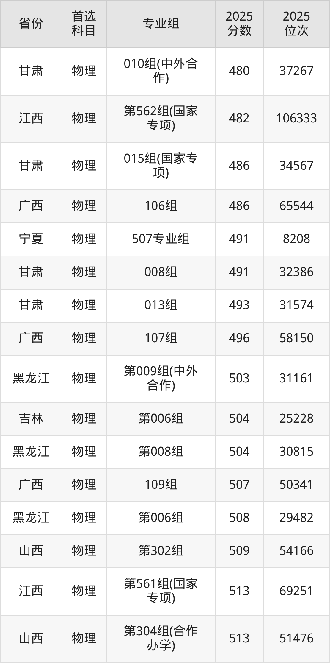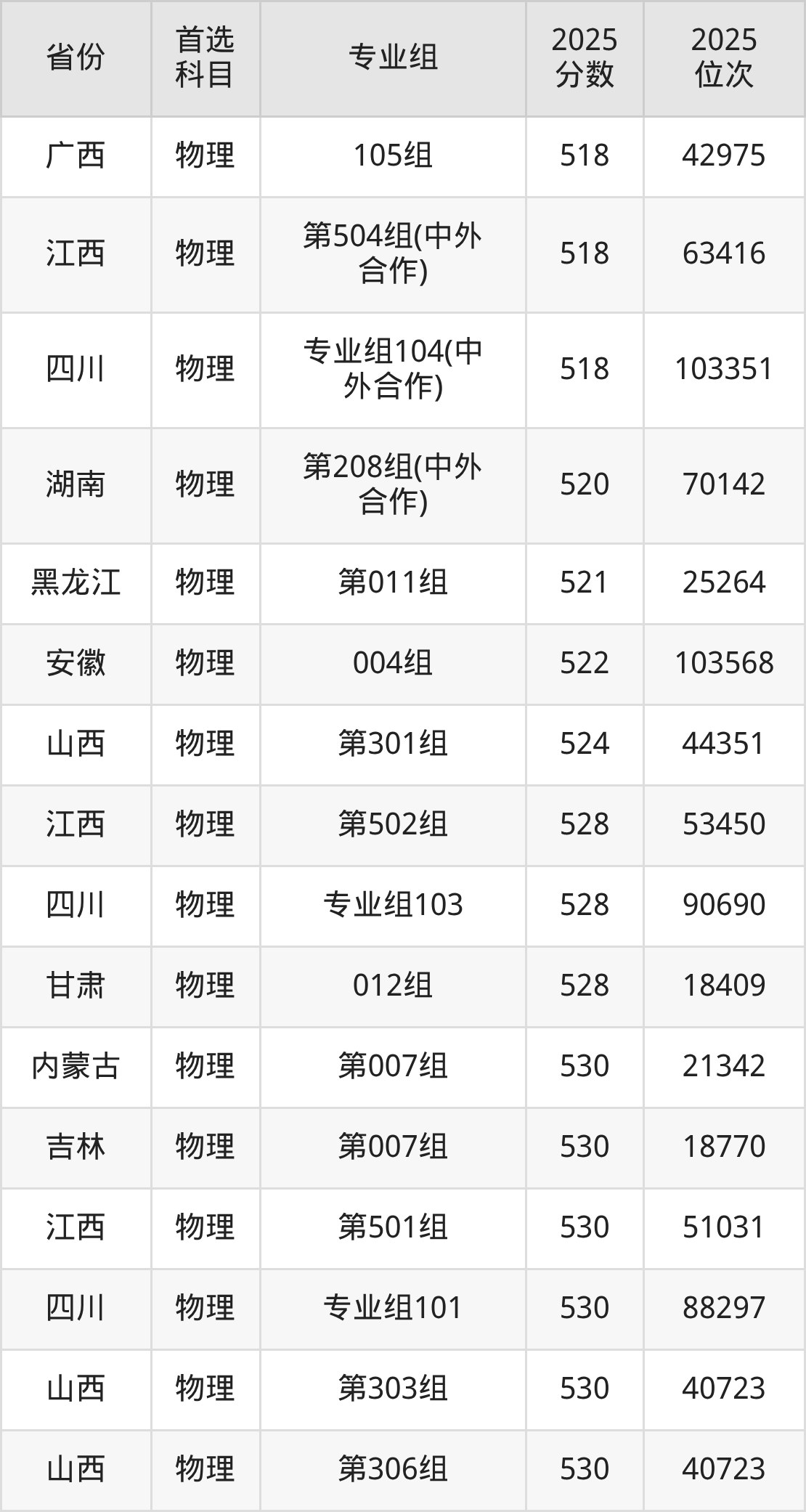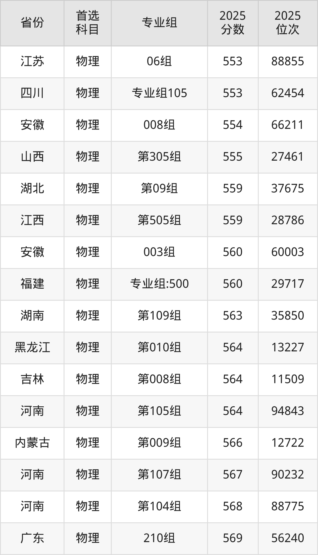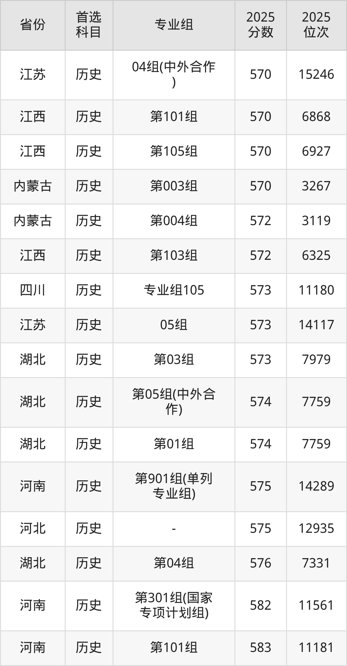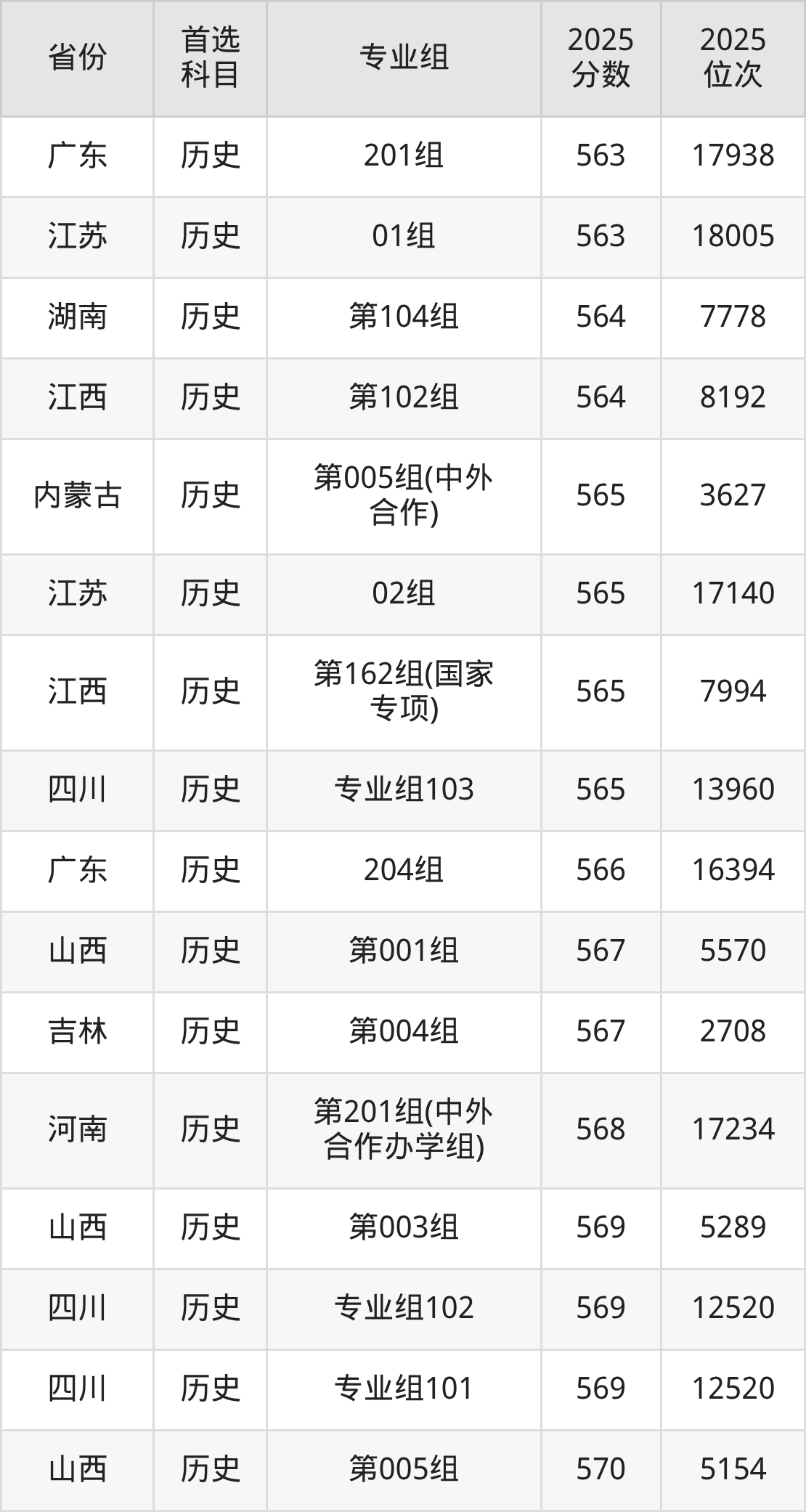 01组540分、28631名,02组539分、28865名,03组541分、28355名,04组540分、28631名,05组572分、19855名,06组538分、29147名,07组544分、27532名,08组538分、29147名,10组(中外合作)540分、28631名;