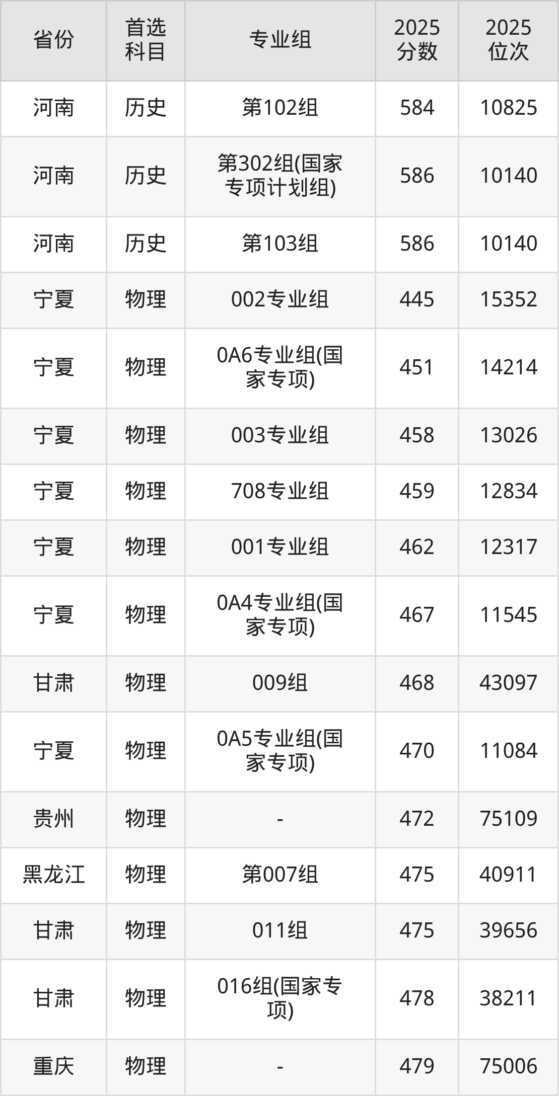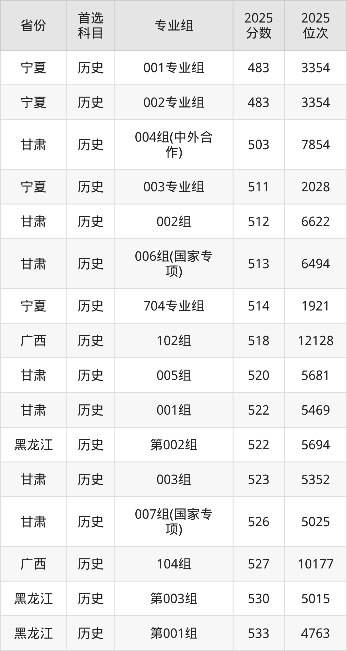 历史类最低分对应地区为宁夏(001专业组),录取位次为3354,超本科B79分;最高分对应地区为河南(第103组),录取位次为10140,超本科线115分。