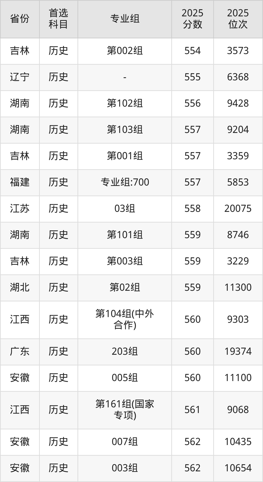 01组534分、29376名,02组533分、29649名,03组535分、29096名,04组542分、27148名,05组568分、20053名,06组535分、29096名,07组533分、29649名,08组542分、27148名,09组(中外合作)540分、27715名;