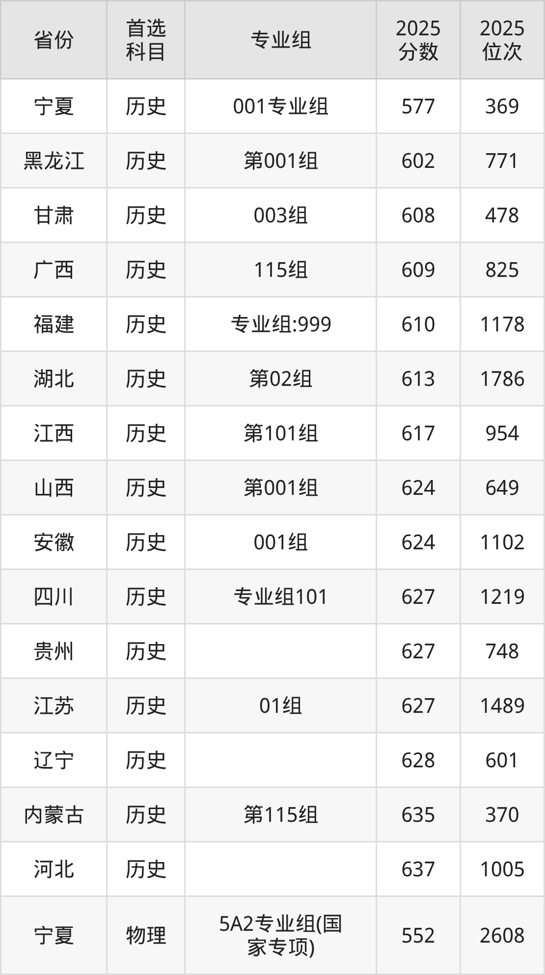 历史类最低分对应地区为宁夏(001专业组),录取位次为369,超本科B173分;最高分对应地区为河北,录取位次为1005。