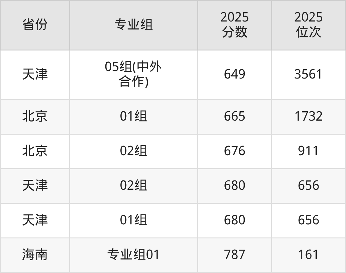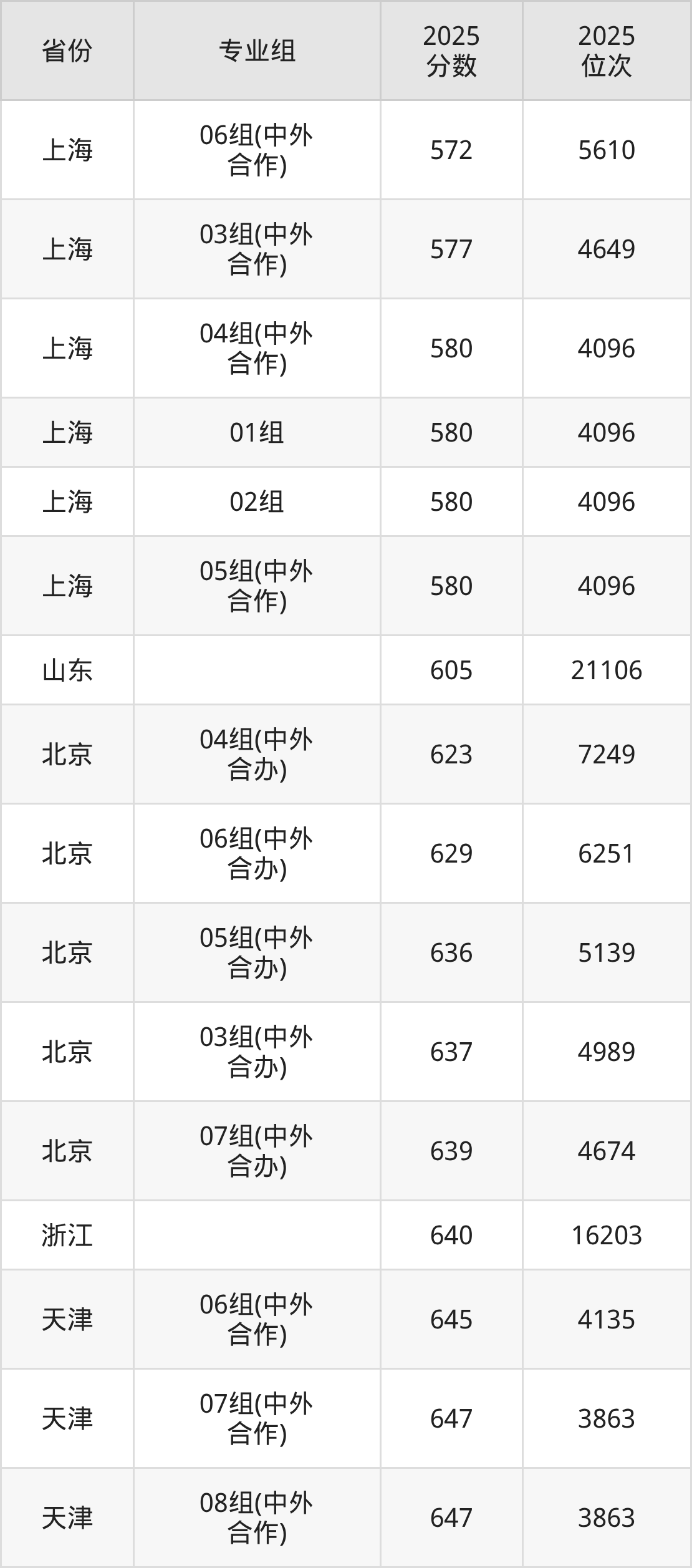 最低分对应地区为上海(06组(中外合作)),录取位次为5610;最高分对应地区为海南(专业组01),录取位次为161,超本科线307分。