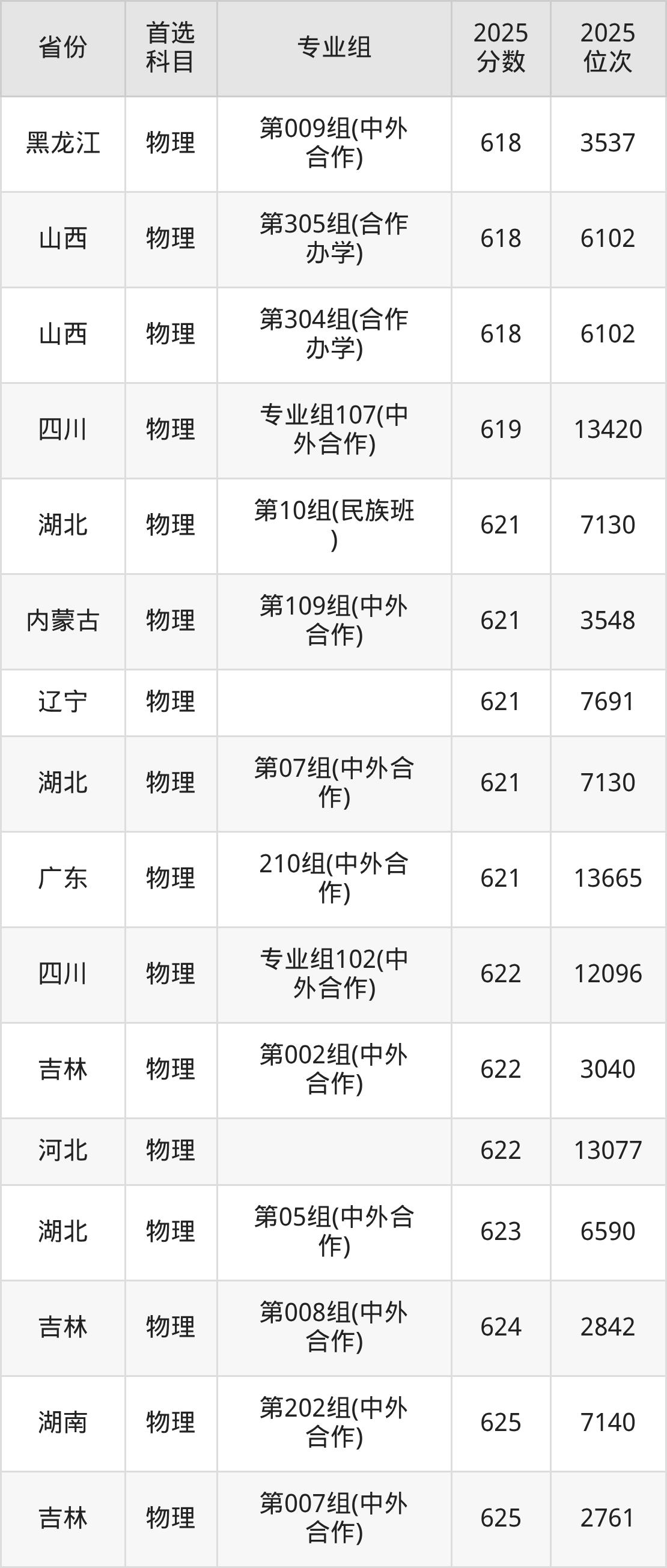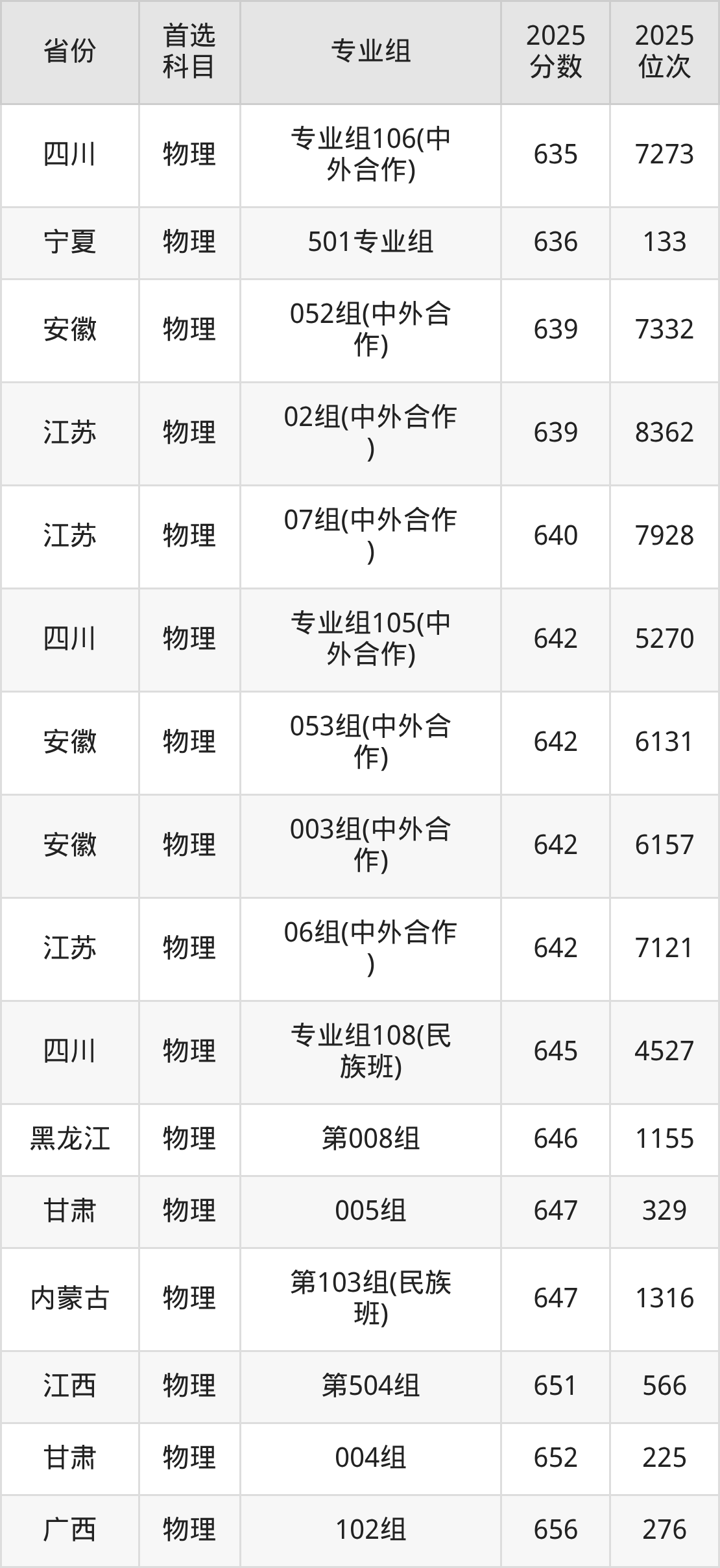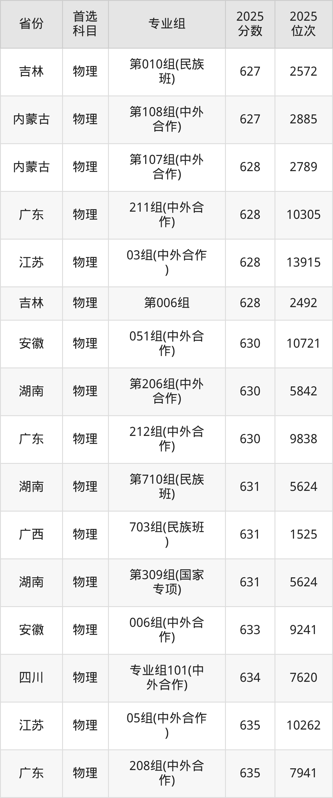 物理类:第003组624分、4924名,第004组(国家专项)652分、1987名,第006组(中外合作)641分、2937名,第007组(中外合作)624分、4924名,第008组664分、1170名,第009组645分、2570名,第010组(中外合作)642分、2844名,第011组(中外合作)640分、3033名,第012组(中外合作)627分、4501名,第013组(民族班)654分、1833名;