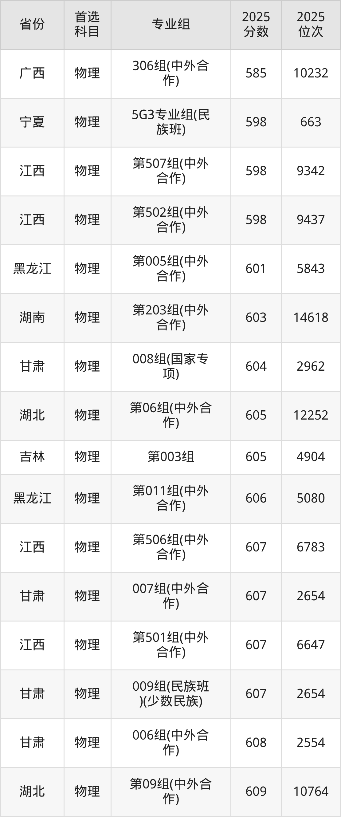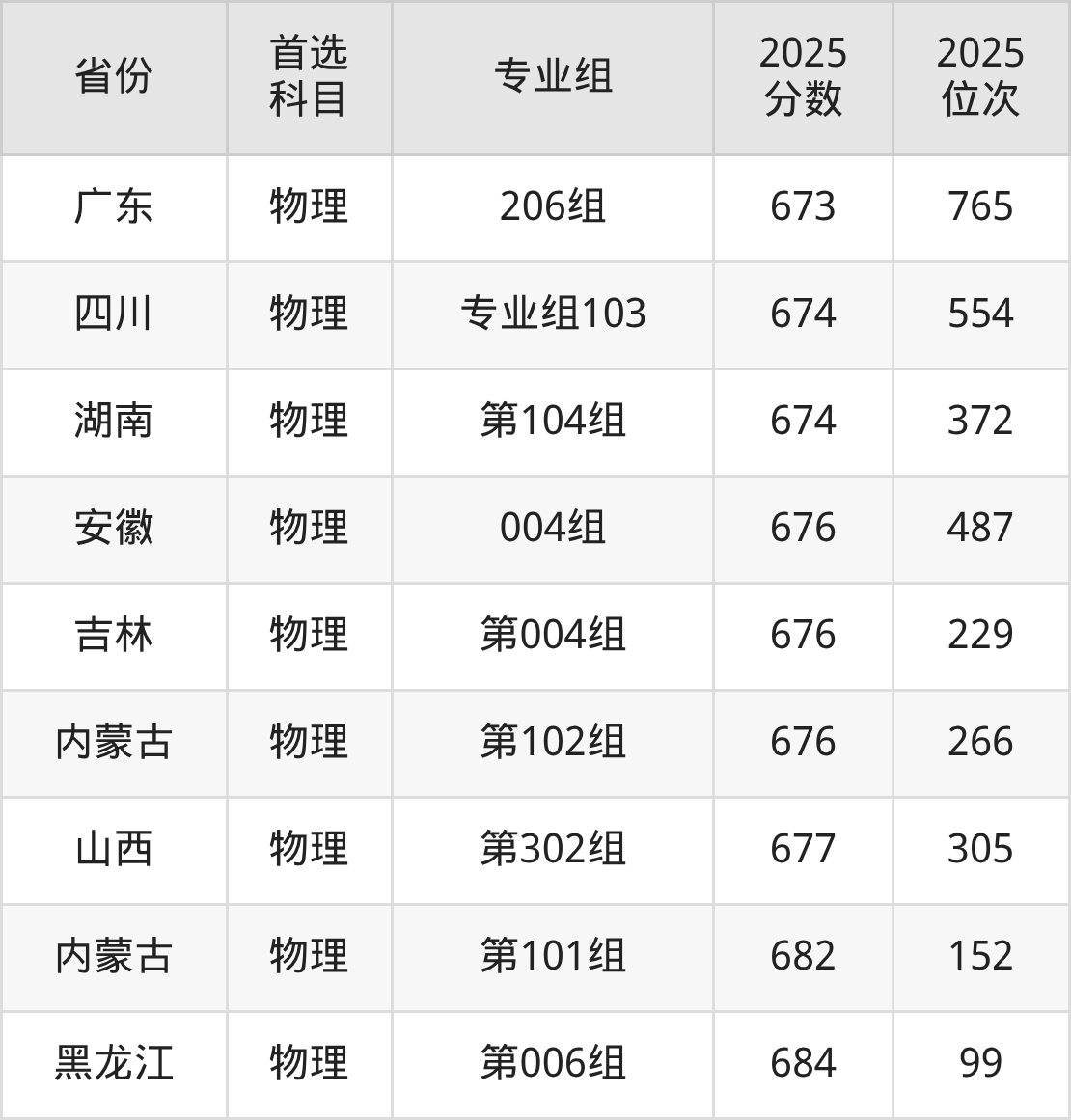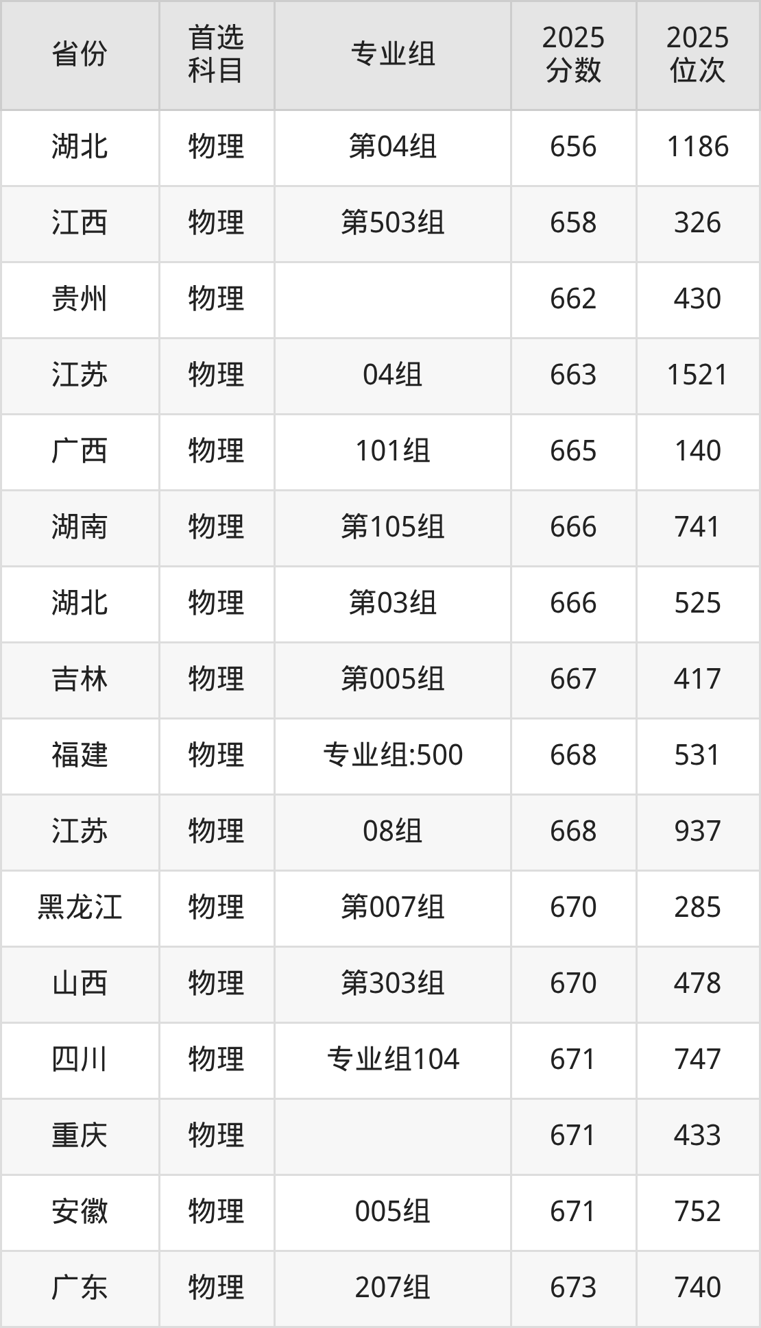 物理类:第003组624分、4924名,第004组(国家专项)652分、1987名,第006组(中外合作)641分、2937名,第007组(中外合作)624分、4924名,第008组664分、1170名,第009组645分、2570名,第010组(中外合作)642分、2844名,第011组(中外合作)640分、3033名,第012组(中外合作)627分、4501名,第013组(民族班)654分、1833名;