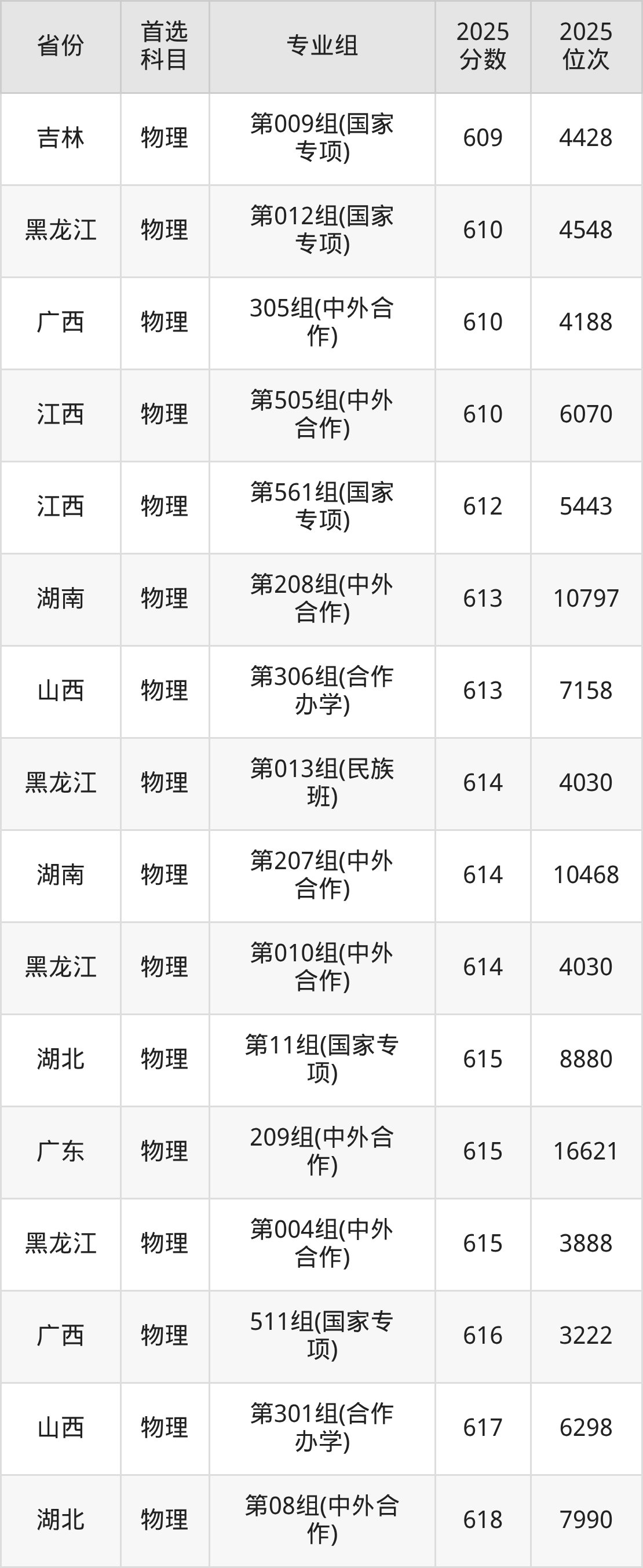 物理类:第004组(中外合作)615分、3888名,第005组(中外合作)601分、5843名,第006组684分、99名,第007组670分、285名,第008组646分、1155名,第009组(中外合作)618分、3537名,第010组(中外合作)614分、4030名,第011组(中外合作)606分、5080名,第012组(国家专项)610分、4548名,第013组(民族班)614分、4030名;