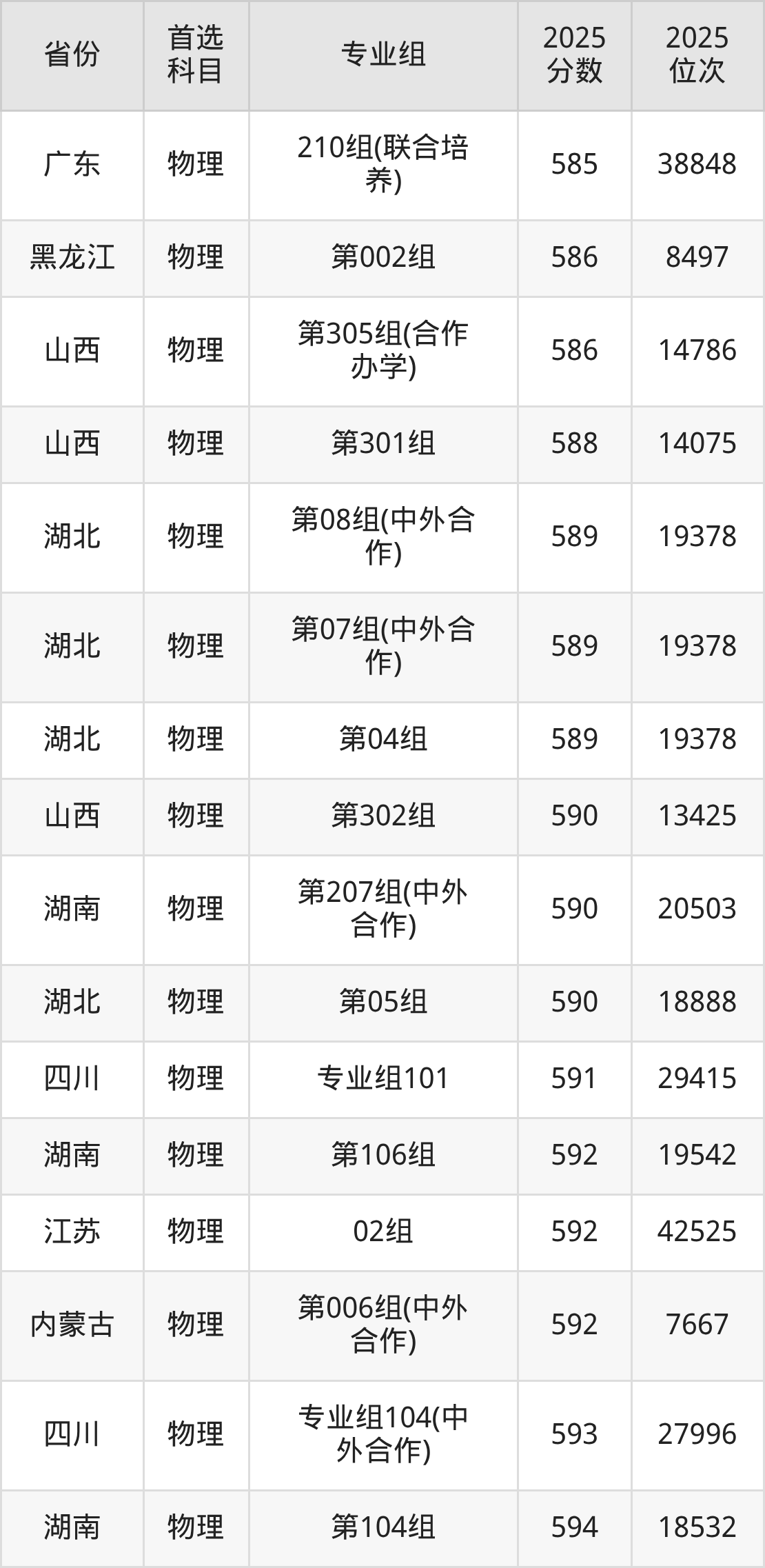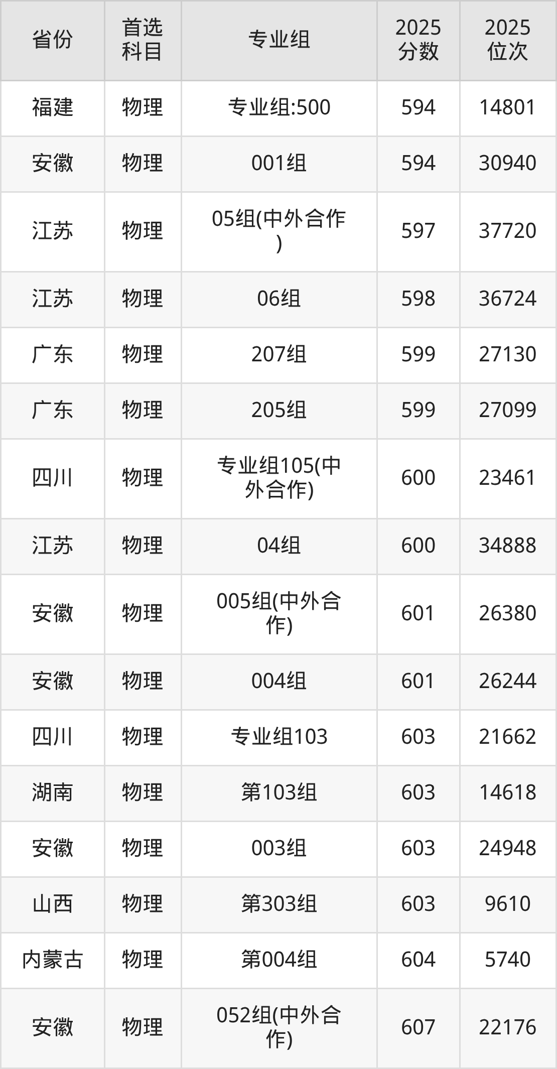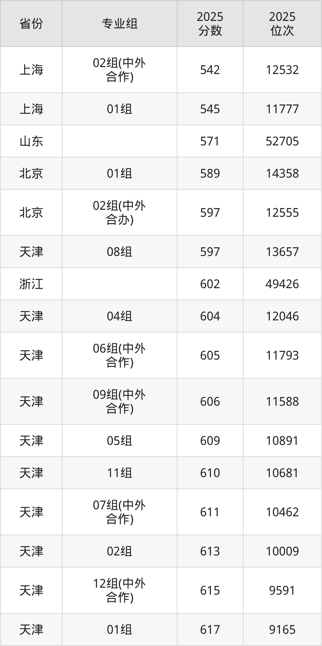 01组610分、9504名,02组607分、10160名,03组621分、7197名,04组607分、10160名,05组602分、11304名,06组(中外合作)595分、12966名,07组(中外合作)610分、9504名,08组595分、12966名,09组(中外合作)598分、12245名;