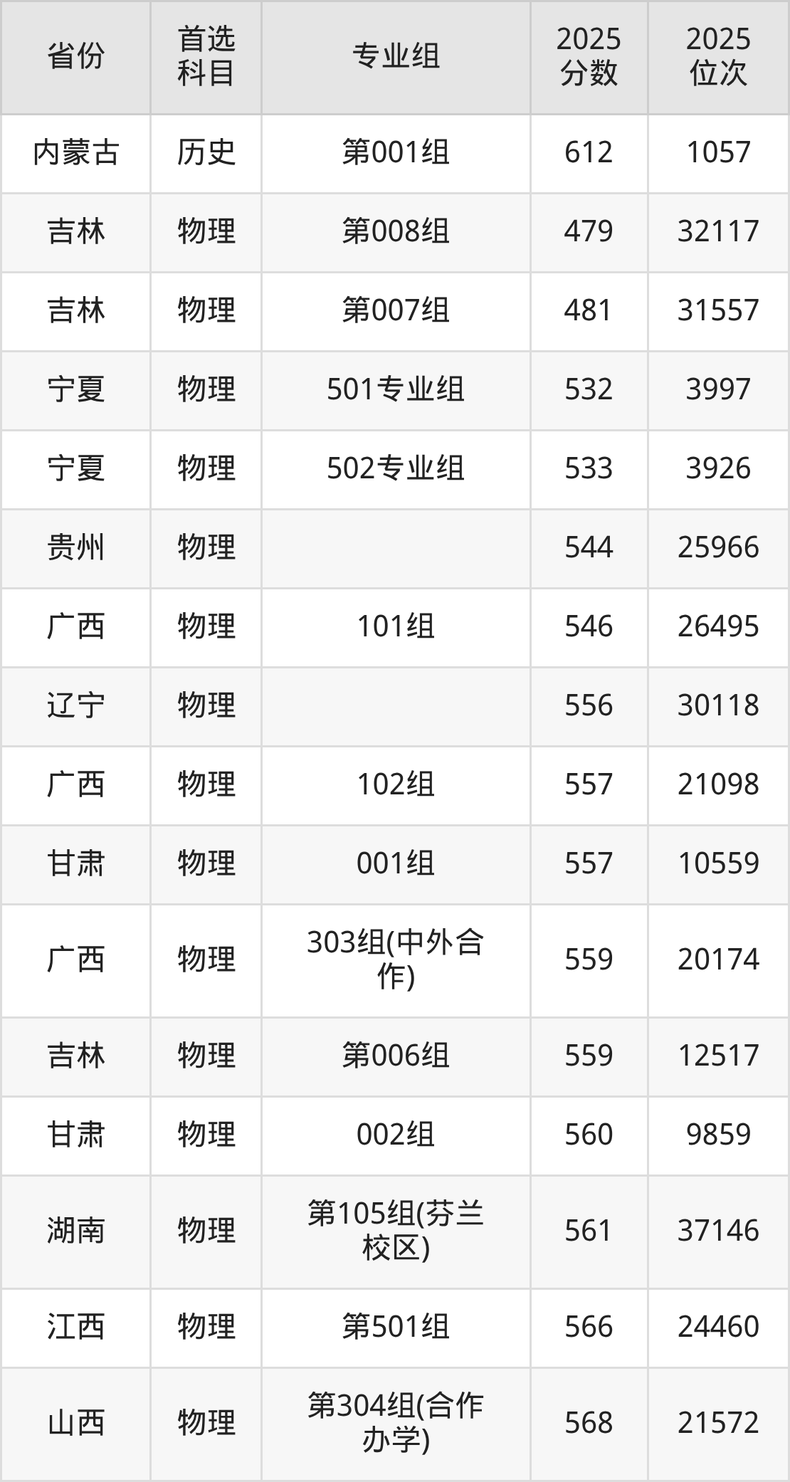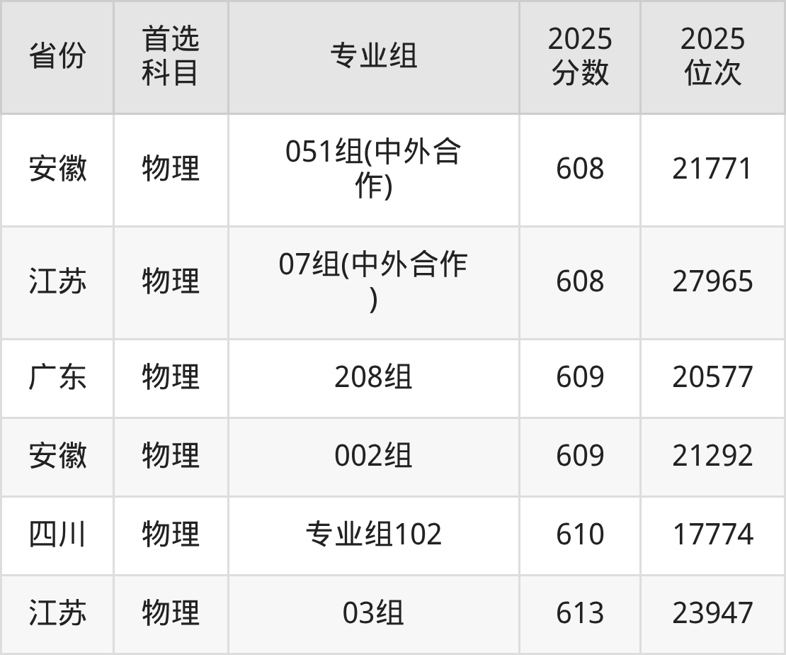 物理类最低分对应地区为吉林(第008组),录取位次为32117,超本科线139分;最高分对应地区为江苏(03组),录取位次为23947。