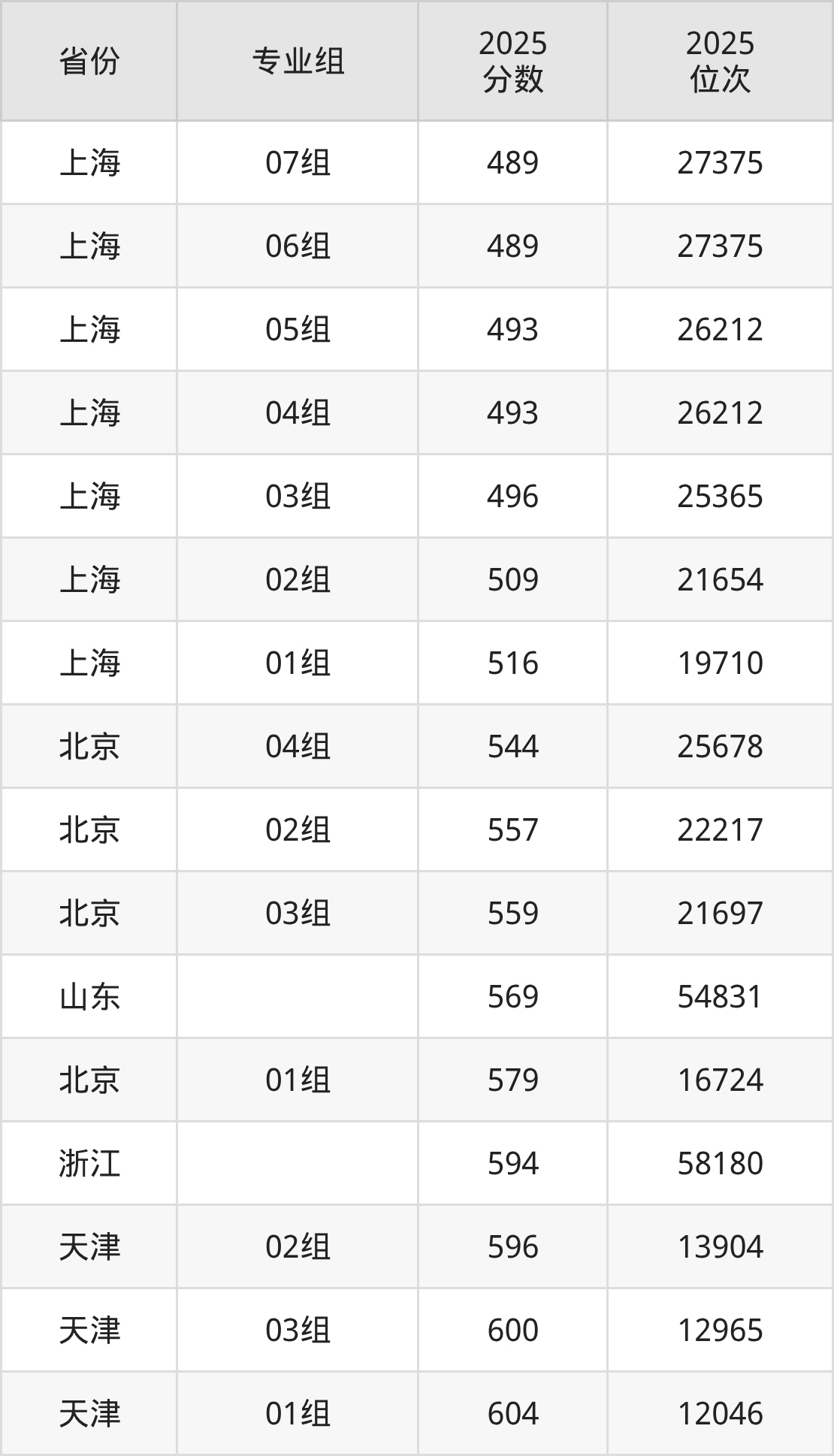 01组516分、19710名,02组509分、21654名,03组496分、25365名,04组493分、26212名,05组493分、26212名,06组489分、27375名,07组489分、27375名;