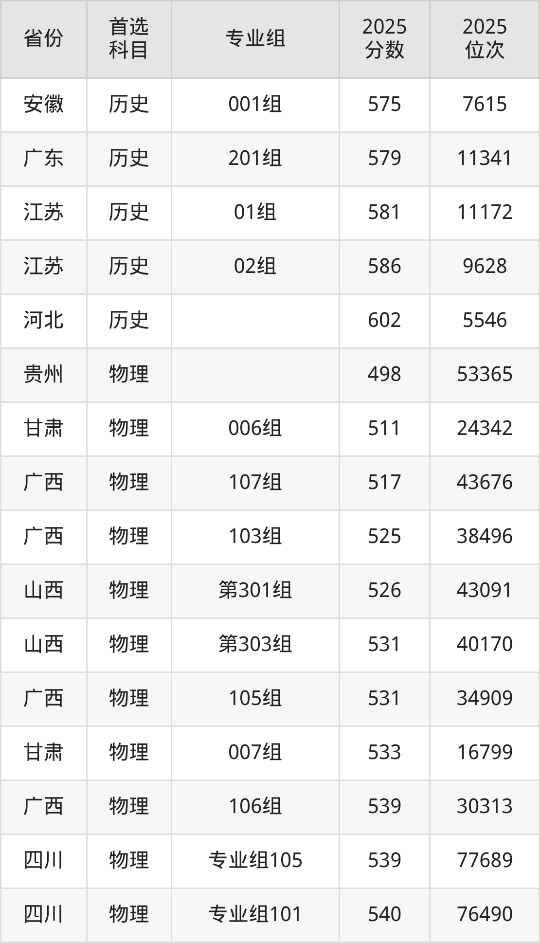 历史类最低分对应地区为甘肃(005组),录取位次为4488,超本科线119分;最高分对应地区为河北,录取位次为5546,超本科线125分。