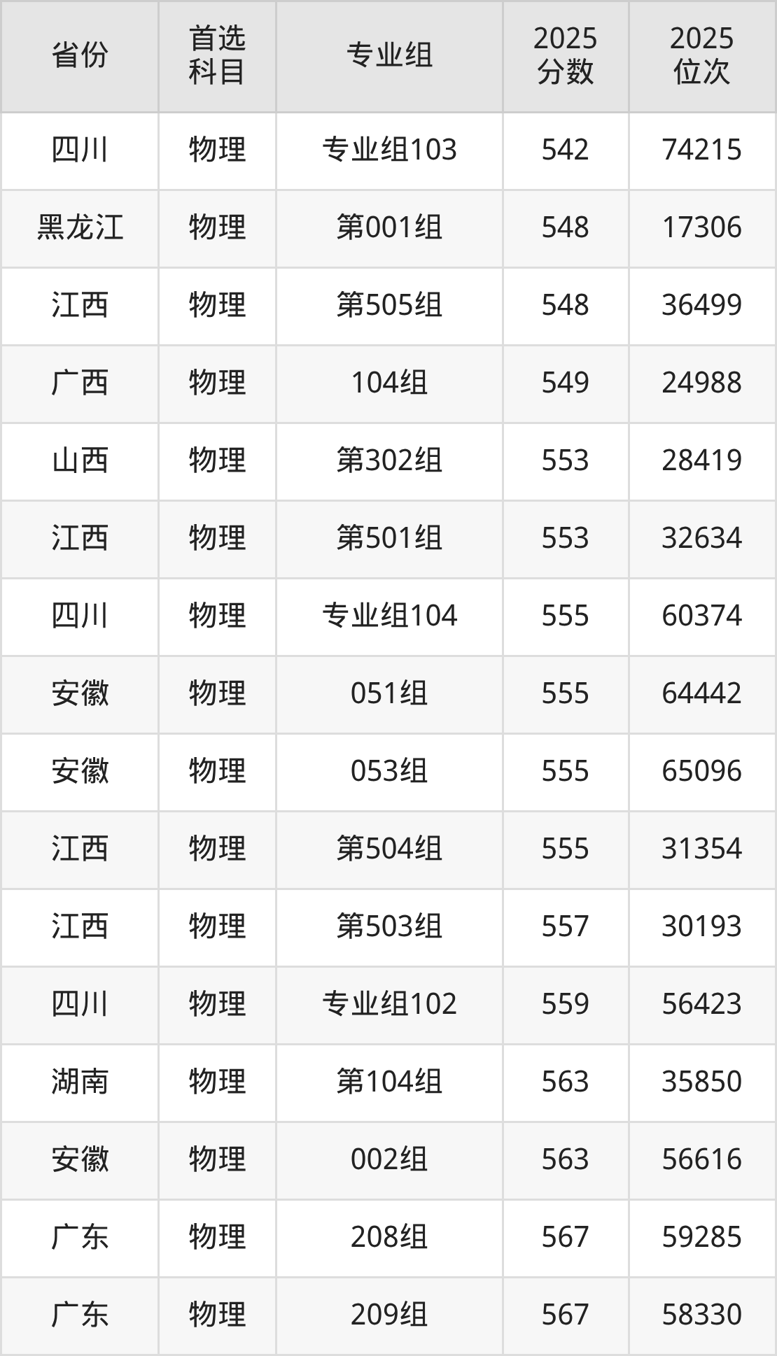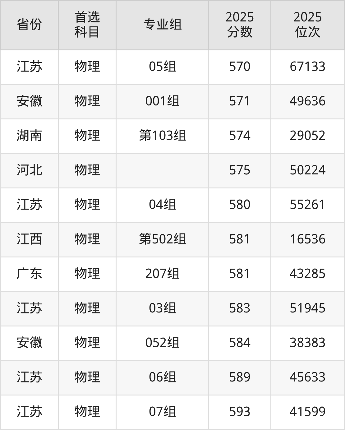 物理类最低分对应地区为贵州,录取位次为53365,超本科线111分;最高分对应地区为江苏(07组),录取位次为41599。