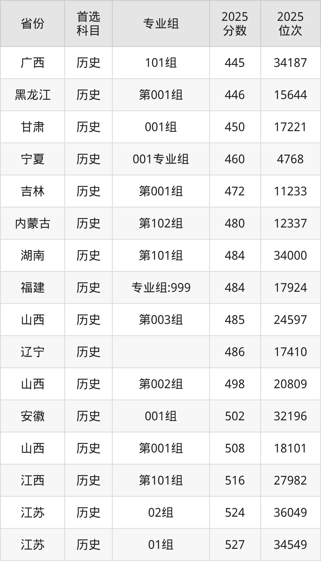 历史类最低分对应地区为广西(101组),录取位次为34187,超本科线43分;最高分对应地区为河北,录取位次为31846,超本科线54分。