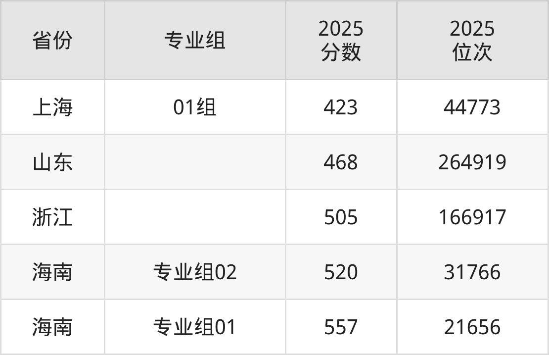 最低分对应地区为上海(01组),录取位次为44773,超本科线21分;最高分对应地区为海南(专业组01),录取位次为21656,超本科线77分。