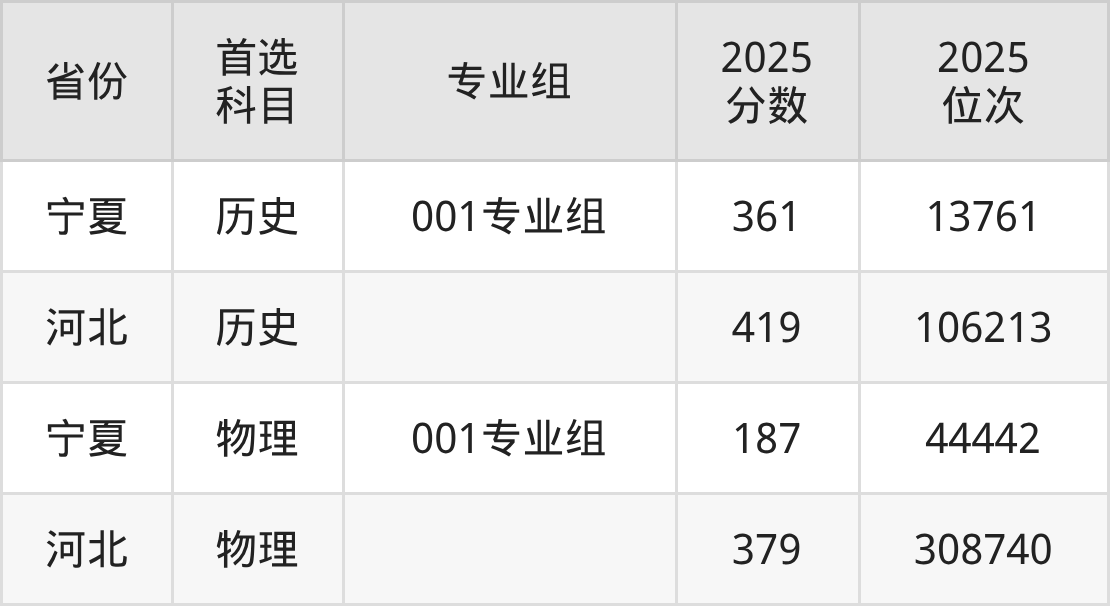 2025年宁夏卫生健康职业技术学院在新高考3+1+2地区的录取分数线为:历史类361分-419分、物理类187分-379分。