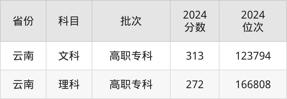 理科最低分对应地区为云南,录取位次为166808,超专科线72分。