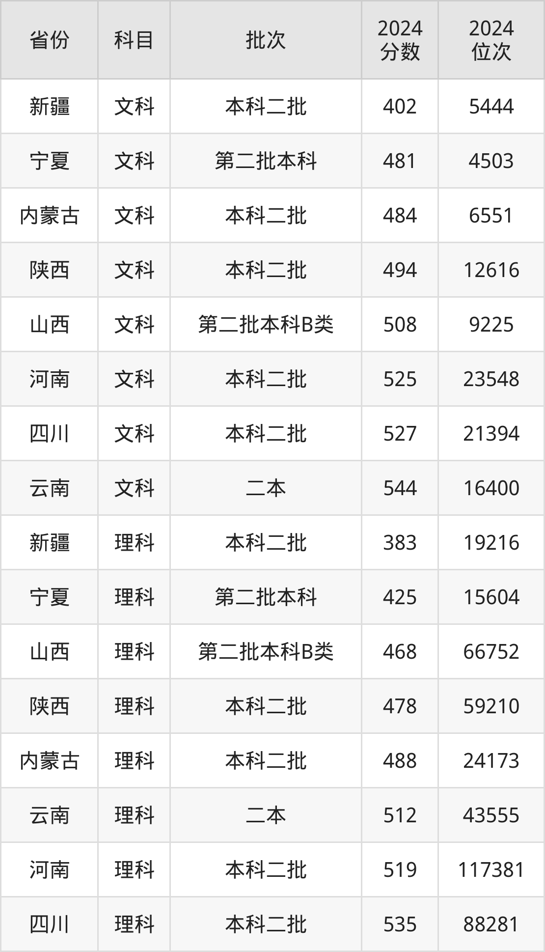文科最低分对应地区为新疆,录取位次为5444,超二本线98分;最高分对应地区为云南,录取位次为16400,超二本线64分。