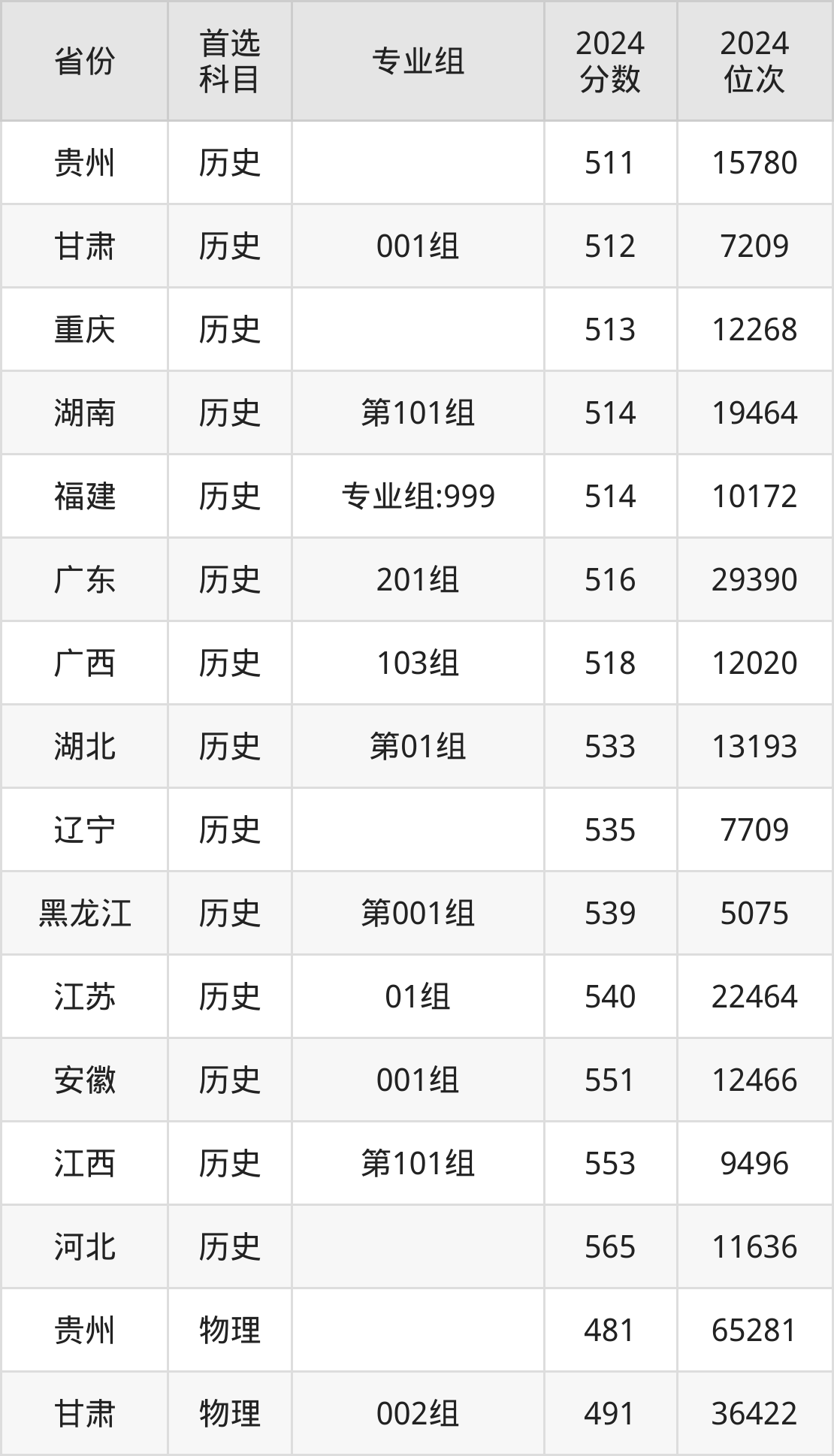 历史类最低分对应地区为贵州,录取位次为15780,超本科线69分;最高分对应地区为河北,录取位次为11636,超本科线116分。