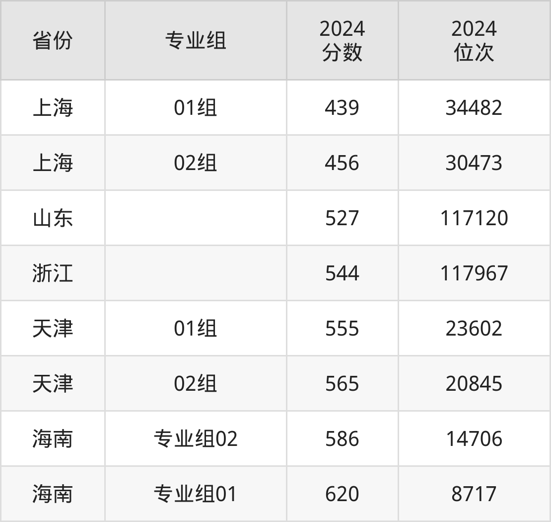 最低分对应地区为上海(01组),录取位次为34482,超本科线36分;最高分对应地区为海南(专业组01),录取位次为8717,超本科线137分。