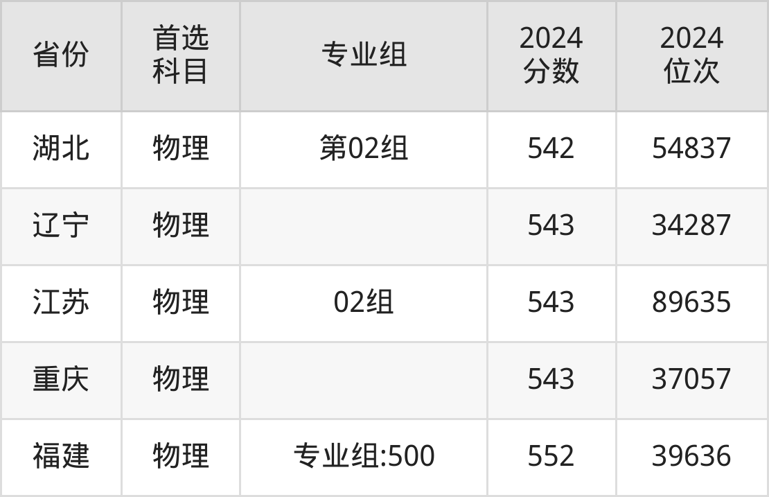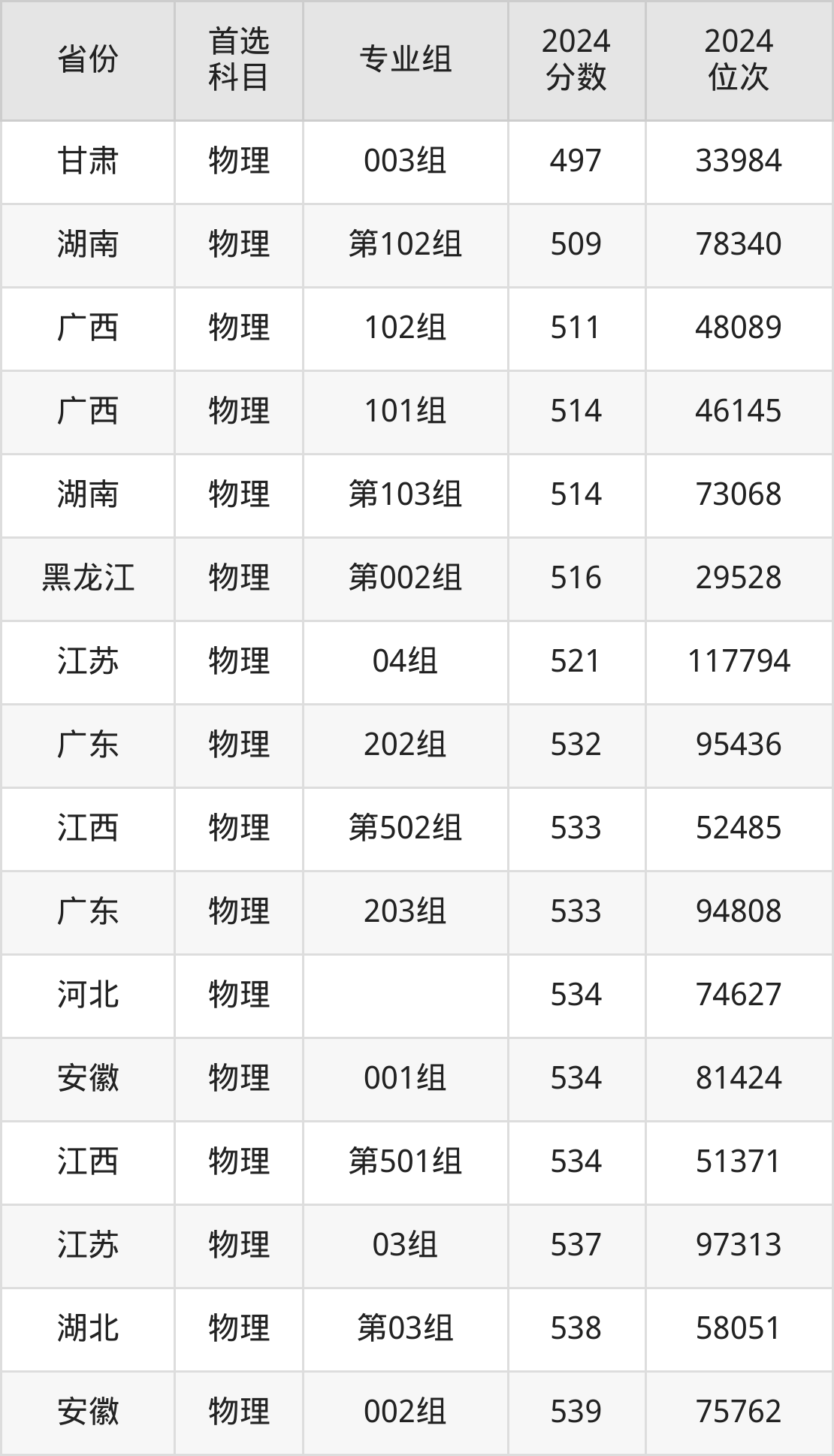 物理类最低分对应地区为贵州,录取位次为65281,超本科线101分;最高分对应地区为福建(专业组:500),录取位次为39636,超本科线103分。
