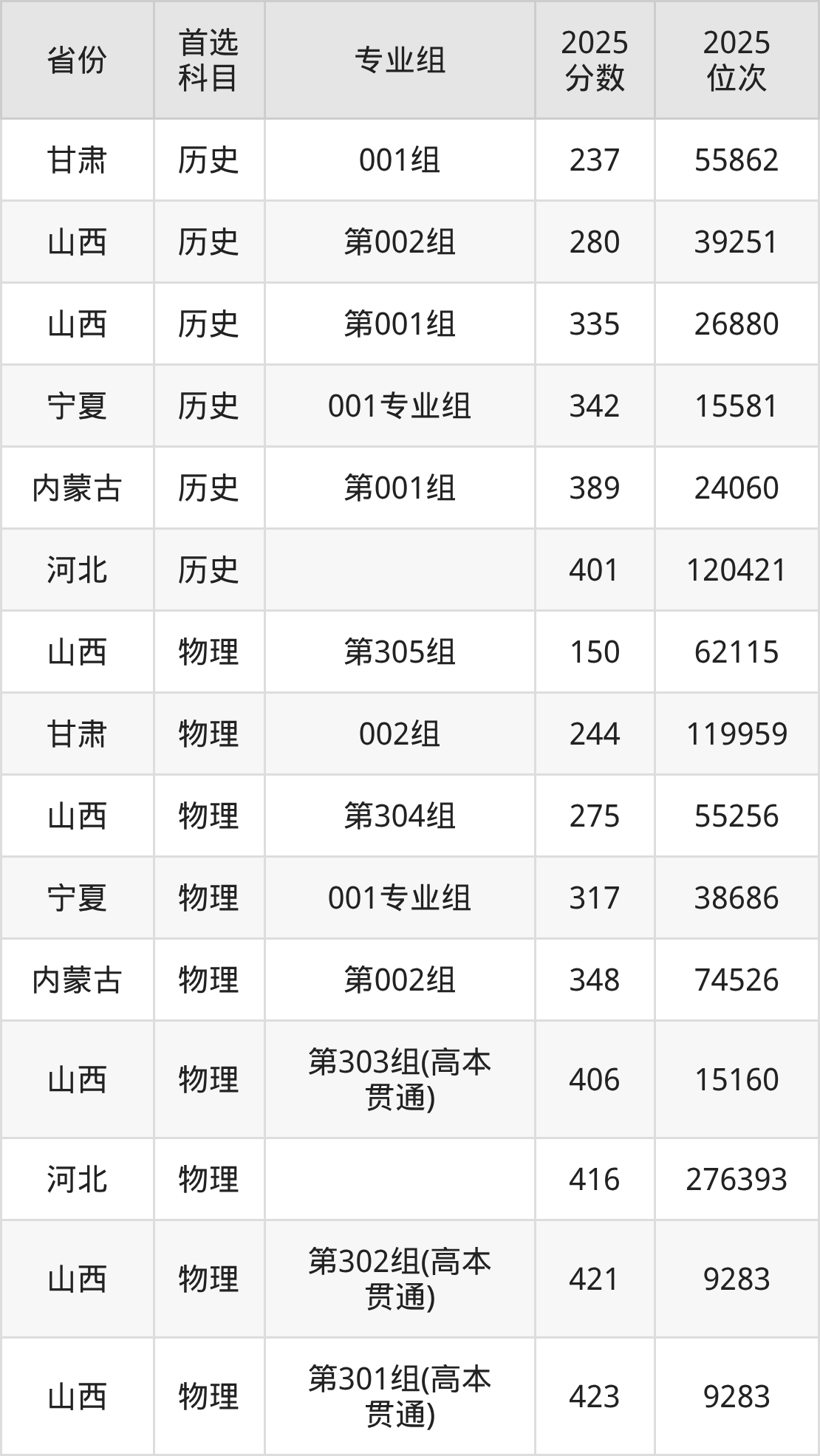 为了方便各地区考生们查看山西水利职业技术学院的录取情况,本文也整理出2025年山西水利职业技术学院在全国各省的录取分数线,供参考。