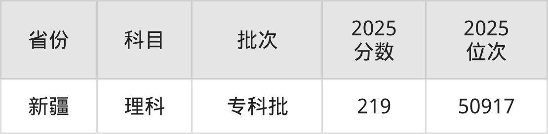 理科最低分对应地区为新疆,录取位次为50917,超专科线79分。
