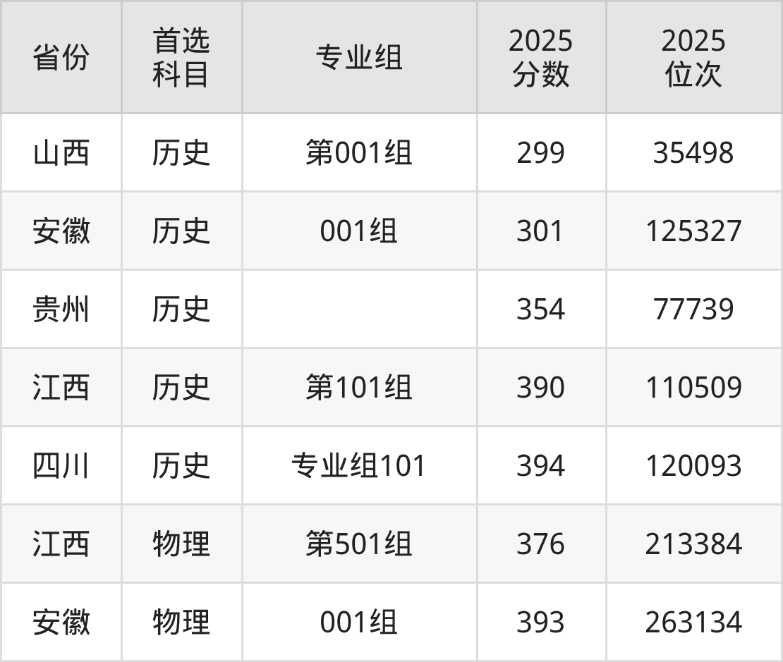 历史类最低分对应地区为山西(第001组),录取位次为35498,超专科线199分;最高分对应地区为四川(专业组101),录取位次为120093,超专科线244分。
