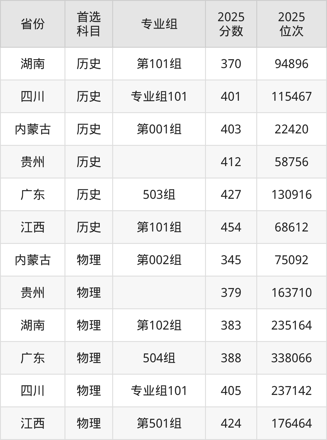 历史类最低分对应地区为湖南(第101组),录取位次为94896;最高分对应地区为江西(第101组),录取位次为68612,超专科线164分。
