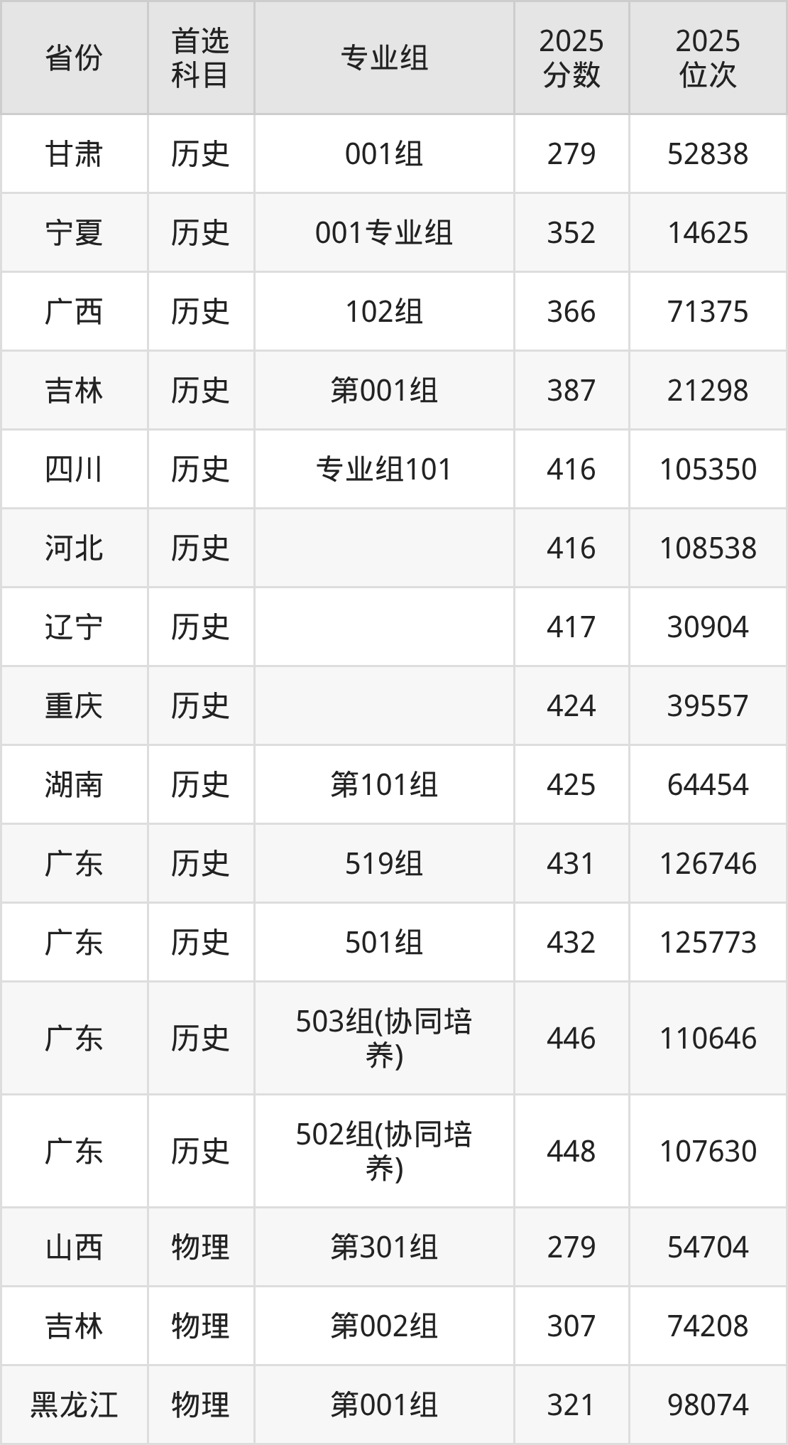 历史类最低分对应地区为甘肃(001组),录取位次为52838,超专科线119分;最高分对应地区为广东(502组(协同培养)),录取位次为107630,超专科线233分。