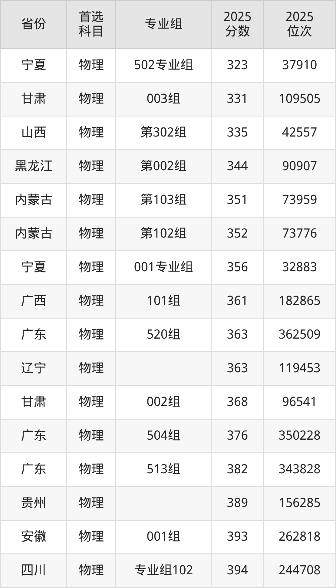 物理类:504组376分、350228名,505组422分、295986名,507组421分、297297名,508组(协同培养)406分、316679名,509组(协同培养)401分、322860名,510组(协同培养)417分、302993名,511组(协同培养)413分、308558名,512组402分、321690名,513组382分、343828名,518组414分、306544名,520组363分、362509名;