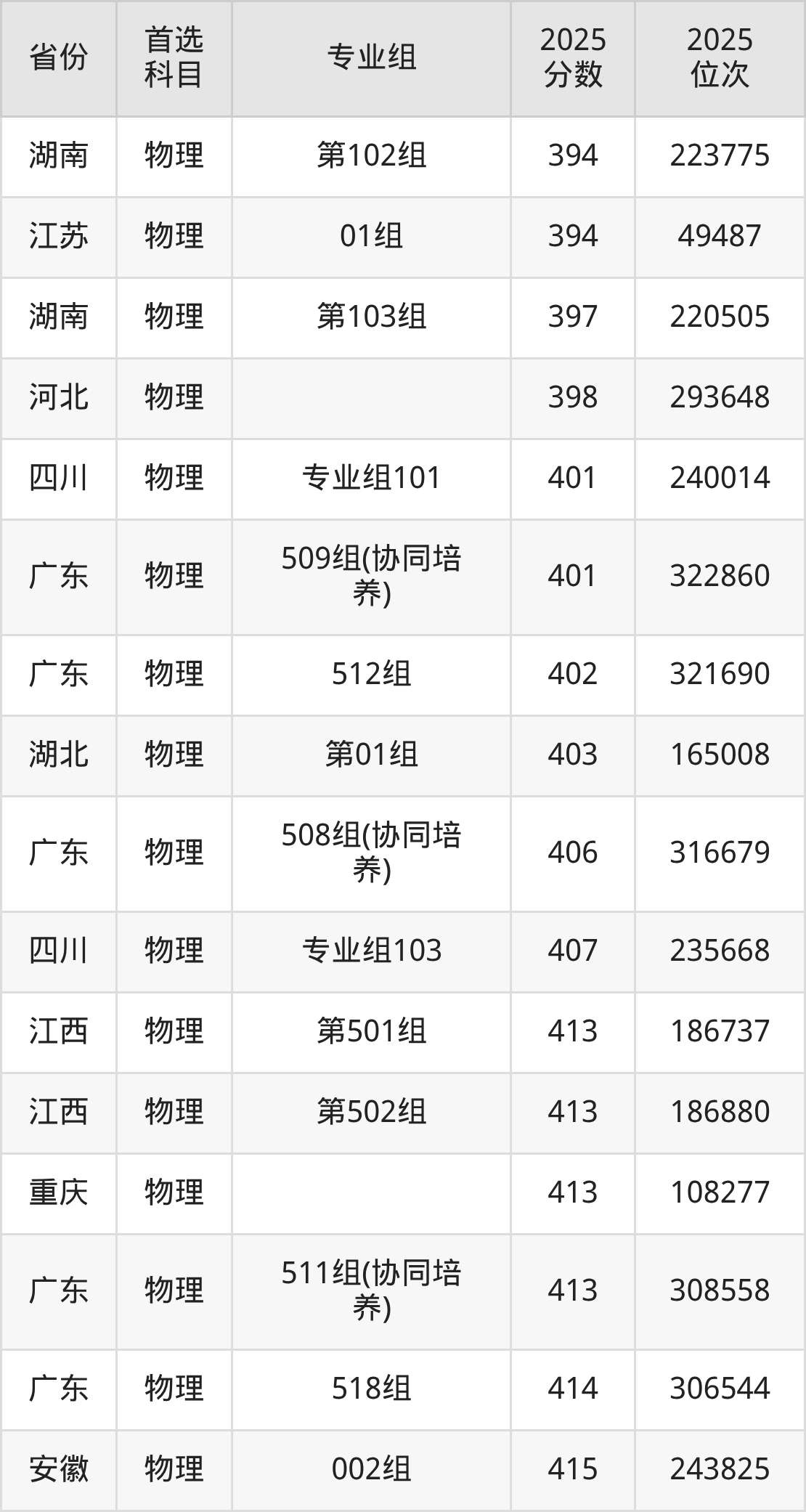 物理类:507组(协同培养)414分、298504名,509组(协同培养)423分、284655名,510组(协同培养)423分、284501名,511组427分、277910名,513组418分、292758名,514组395分、325739名,515组412分、301326名,521组(协同培养)421分、288222名,522组389分、333847名,523组421分、288020名;