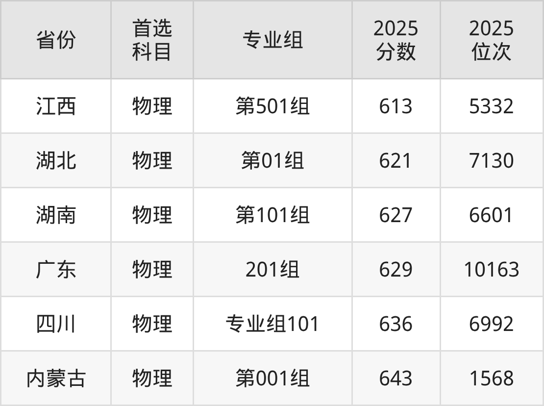 物理类最低分对应地区为江西(第501组),录取位次为5332,超本科线184分;最高分对应地区为内蒙古(第001组),录取位次为1568,超本科线268分。