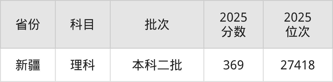 理科最低分对应地区为新疆,录取位次为27418,超二本线89分。